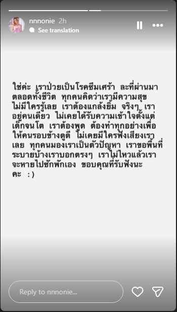"ใช่ค่ะ เราป่วยเป็นโรคซึมเศร้า ละที่ผ่านมาตลอดทั้งชีวิต ทุกคนคิดว่าเรามีความสุข ไม่มีใครรู้เลย เราต้องแกล้งยิ้ม