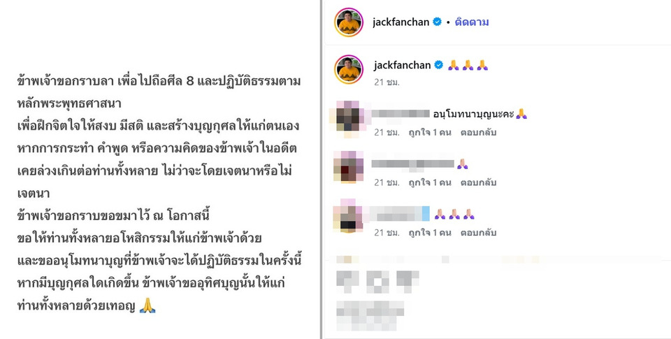 แห่อนุโมทนาบุญสนั่นโซเชียล เมื่อนักแสดงอารมณ์ดี แจ็ค เฉลิมพล หรือ "แจ็ค แฟนฉัน" ออกมาโพสต์ข้อความกราบขอขมา ลาไปถือศีล 8 ปฏิบัติธรรม ผ่านอินสตาแกรมส่วนตัว โดยระบุว่า "ข้าพเจ้าขอกราบลา เพื่อไปถือศีล 8 และปฏิบัติธรรมตามหลักพระพุทธศาสนา เพื่อฝึกจิตใจให้สงบ มีสติ และสร้างบุญกุศลให้แก่ตนเอง หากการกระทำ คำพูด หรือความคิดของข้าพเจ้าในอดีตเคยล่วงเกินต่อท่านทั้งหลาย ไม่ว่าจะโดยเจตนาหรือไม่เจตนา