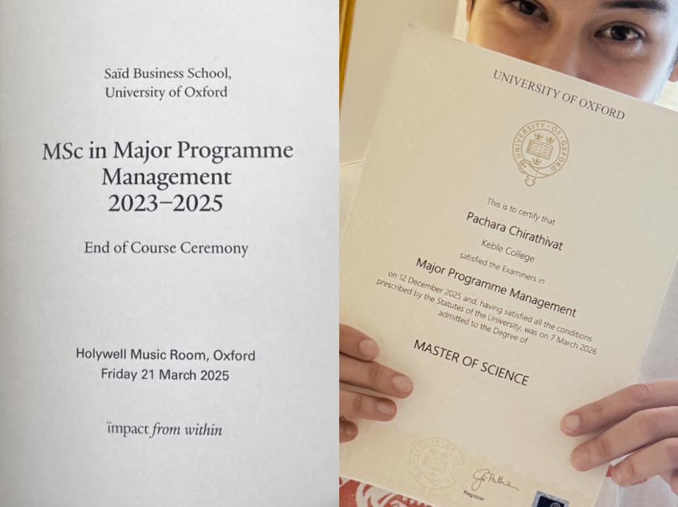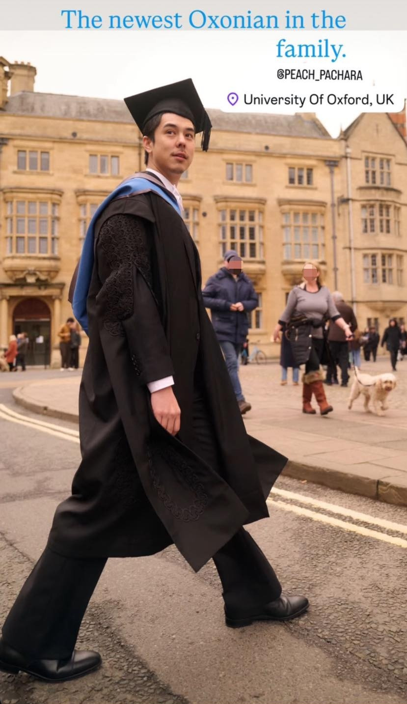 โดย พีช พชร ในวัย 31 ปี เพิ่งสำเร็จการศึกษาระดับปริญญาโท Major Programme Management จาก Keble College, University of Oxford ประเทศอังกฤษ ซึ่งก่อนหน้านี้เมื่อปีที่ผ่านมา พีชเพิ่งรับปริญญาโทจาก Saïd Business School, University of Oxford ไปหมาดๆ นับเป็นการคว้าปริญญาโทจากมหาวิทยาลัยระดับโลกถึง 2 ใบติดต่อกัน ซึ่งสร้างความภาคภูมิใจให้กับครอบครัวอย่างมาก