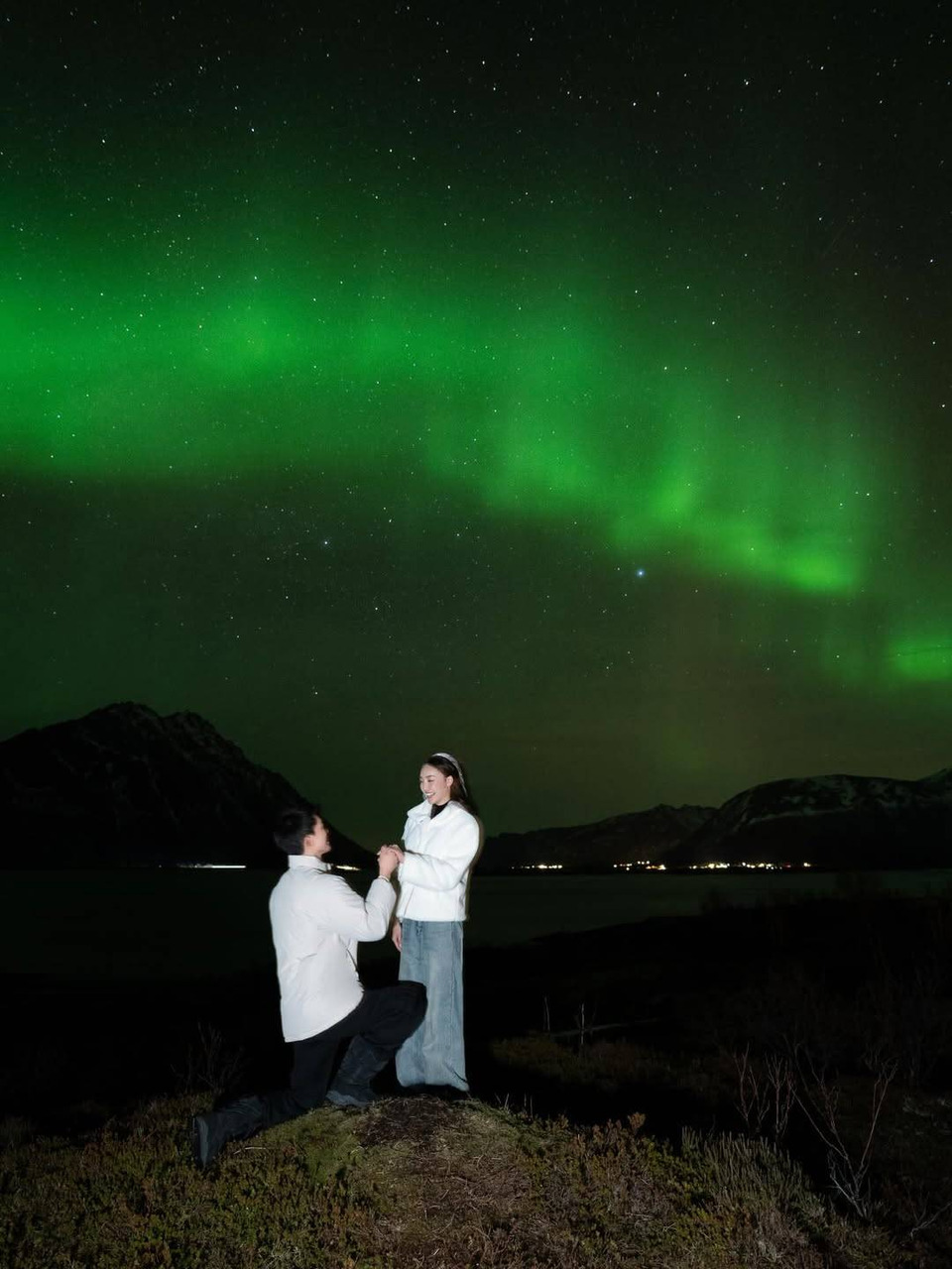 โดยฝ่ายชายได้สร้างโมเมนต์สุดโรแมนติก ด้วยการคุกเข่าขอแฟนสาวแต่งงาน ท่ามกลางบรรยากาศสุดงดงามของ แสงเหนือในประเทศนอร์เวย์ ซึ่งกลายเป็นภาพประทับใจที่ทำให้แฟน ๆ ต่างร่วมลุ้นและยินดีไปกับความรักของทั้งคู่