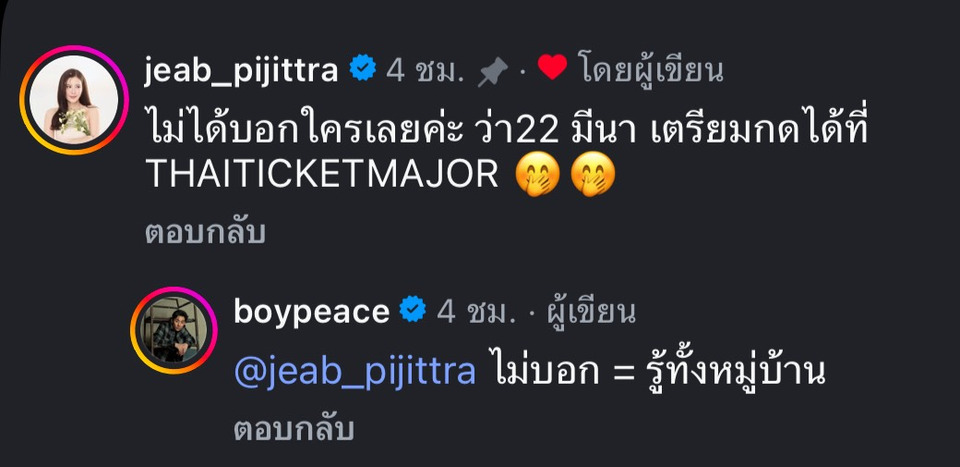 งานนี้หนุ่มบอยยังเขียนแคปชั่นสั้นๆ อีกด้วยว่า.. “อย่าบอกใครนะ =........” ทำเอาแฟนๆ เข้ามาคอมเมนต์แซวกันอย่างมากมาย ว่าไม่บอกใคร = รู้ทั้งหมู่บ้าน, พร้อมกดบัตรแล้ว อย่าไปบอกใครนะพี่เจี๊ยบ, ไม่บอกใครแน่ๆ พร้อมกดแล้ว ฯลฯ