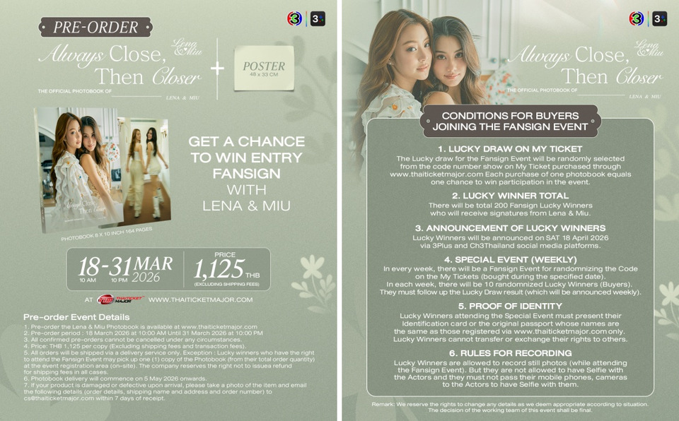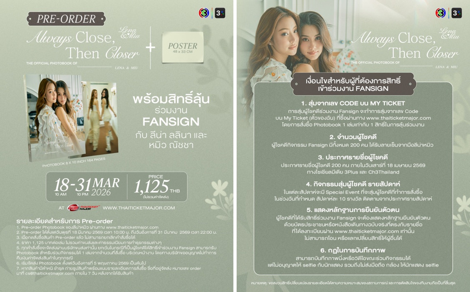 เตรียมจับจองเป็นเจ้าของบันทึกความพิเศษครั้งนี้ได้ใน ราคา 1,125 บาท ทุกการสั่งซื้อมีสิทธิ์ลุ้นกิจกรรม Fansign สุด exclusive จำนวน 200 ท่าน ติดตามรายละเอียด Special Event รายสัปดาห์ได้ทางโซเชียล Ch3Thailand และ 3Plus โดยจะเปิดพรีออเดอร์ตั้งแต่วันพุธที่ 18 มีนาคม 2569 เวลา 10:00 น. ถึง วันอังคารที่ 31 มีนาคม 2569 เวลา 22:00 น. สั่งจองได้ที่ www.thaiticketmajor.com ติดตามรายละเอียดเพิ่มเติมได้ทาง Ch3 Thailand และ 3Plus