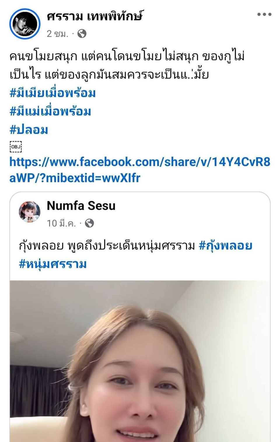 พี่หนุ่ม ศรราม ถึงกับทนไม่ไหว แชร์คลิปดังกล่าวมาโพสต์ลงเฟซบุ๊กส่วนตัว "ศรราม เทพพิทักษ์"