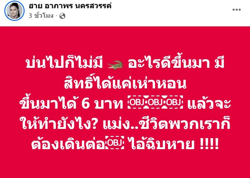 โดย “ฮาย อาภาพร” ได้ลั่นโพสต์ผ่านเฟซบุ๊กว่า "บ่นไปก็ไม่มี ???? อะไรดีขึ้นมา มีสิทธิ์ได้แค่เห่าหอน ขึ้นมาได้ 6 บาท แล้วจะให้ทำยังไง? แม่ง..ชีวิตพวกเราก็ต้องเดินต่อไอ้-ิบหาย !!!!"