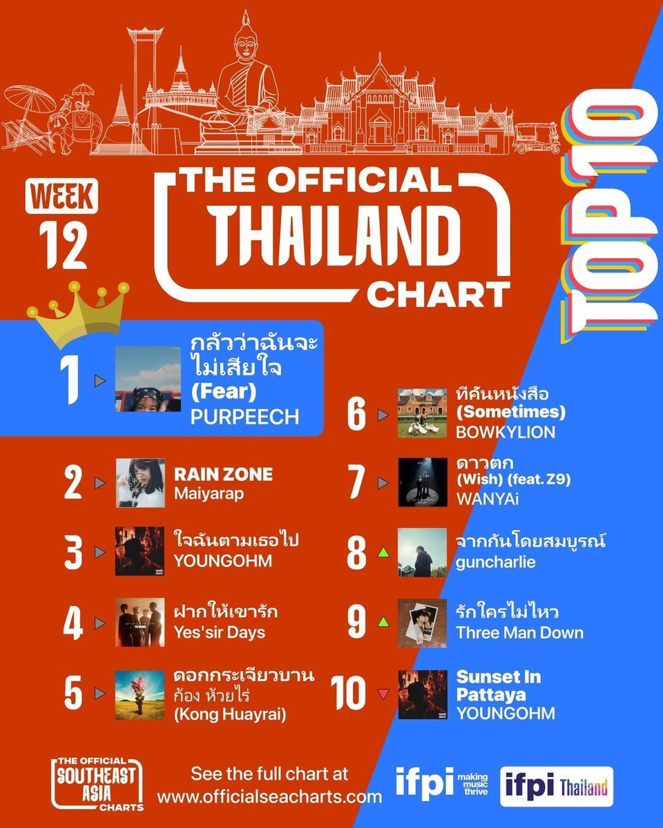 วงอินดี้มาแรง PURPEECH สร้างปรากฏการณ์ครั้งสำคัญในวงการเพลงไทย หลังซิงเกิล “กลัวว่าฉันจะไม่เสียใจ (Fear)” พุ่งทะยานขึ้นครองอันดับ 1 บน The Official Thailand Chart ติดต่อกันยาวนานถึง 8 สัปดาห์ ตอกย้ำกระแสความนิยมแบบฉุดไม่อยู่ และกลายเป็นหนึ่งในเพลงที่ถูกพูดถึงมากที่สุดในช่วงเวลานี้