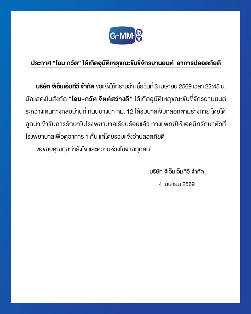 บริษัท จีเอ็มเอ็มทีวี จำกัด ขอแจ้งให้ทราบว่า เมื่อวันที่ 3 เมษายน 2569 เวลา 22:45 น. นักแสดงในสังกัด “โอม-ภวัต จิตต์สว่างดี” ได้เกิดอุบัติเหตุขณะขับขี่จักรยานยนต์ ระหว่างเดินทางกลับบ้าน ที่ถนนบางนา กม. 12 ได้รับบาดเจ็บถลอกตามร่างกาย โดยได้ ถูกนำเข้ารับการรักษาในโรงพยาบาลเรียบร้อยแล้ว ทางแพทย์ให้แอดมิทรักษาตัวที่ โรงพยาบาลเพื่อดูอาการ 1 คืน แต่โดยรวมแล้วปลอดภัยดี
