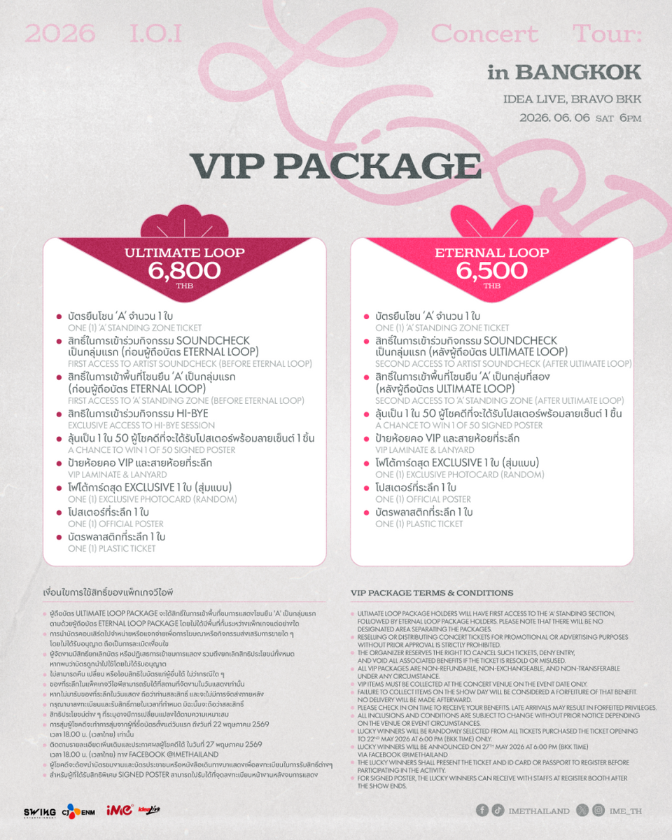 เตรียมซ้อมร้อง ซ้อมเต้น และซ้อมมือไว้ให้พร้อมสำหรับการกดบัตร แล้วมาร่วมเป็นส่วนหนึ่งในโมเมนต์ประวัติศาสตร์ของ I.O.I พร้อมสร้างค่ำคืนแห่งความทรงจำครั้งนี้ไปด้วยกัน! ติดตามรายละเอียดเพิ่มเติมได้ที่ Facebook และ TikTok : @imethailand / X และ Instagram : @ime_th