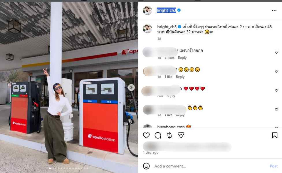 วันที่ 10 เม.ย.69 “ไบรท์” พิชญทัฬห์ จันทร์พุฒ ผู้ประกาศข่าวสาวช่อง 3 โพสต์ภาพคู่ตู้กับจ่ายน้ำมัน ขณะหลบร้อนไปท่องเที่ยวที่ประเทศญี่ปุ่นกับสามี "โต๋ ศักดิ์สิทธิ์ ผ่านอินสตาแกรมส่วนตัว @bright_ch3 พร้อมข้อความระบุว่า...