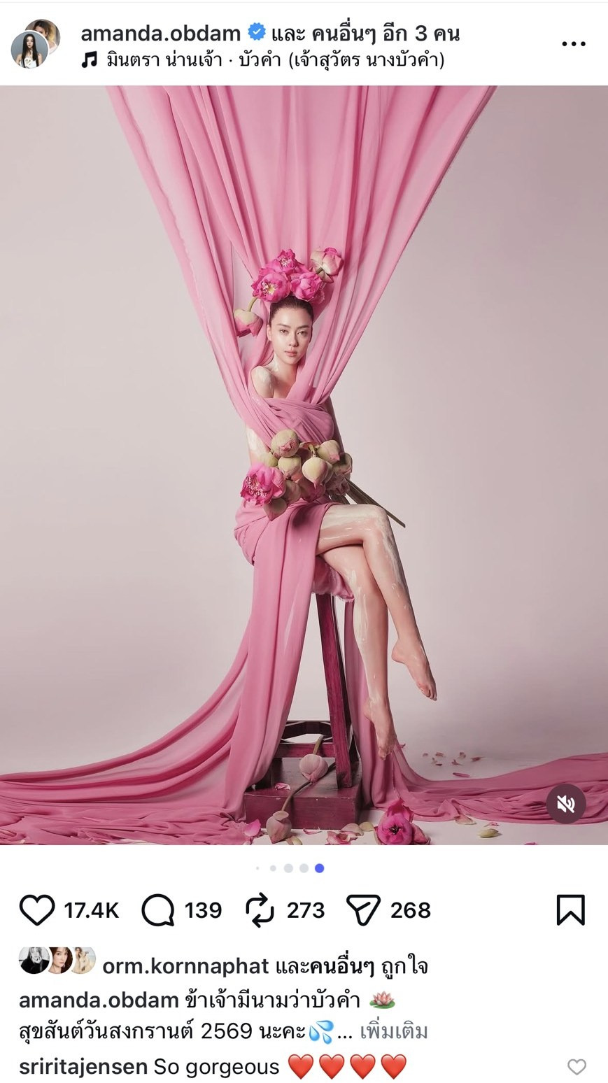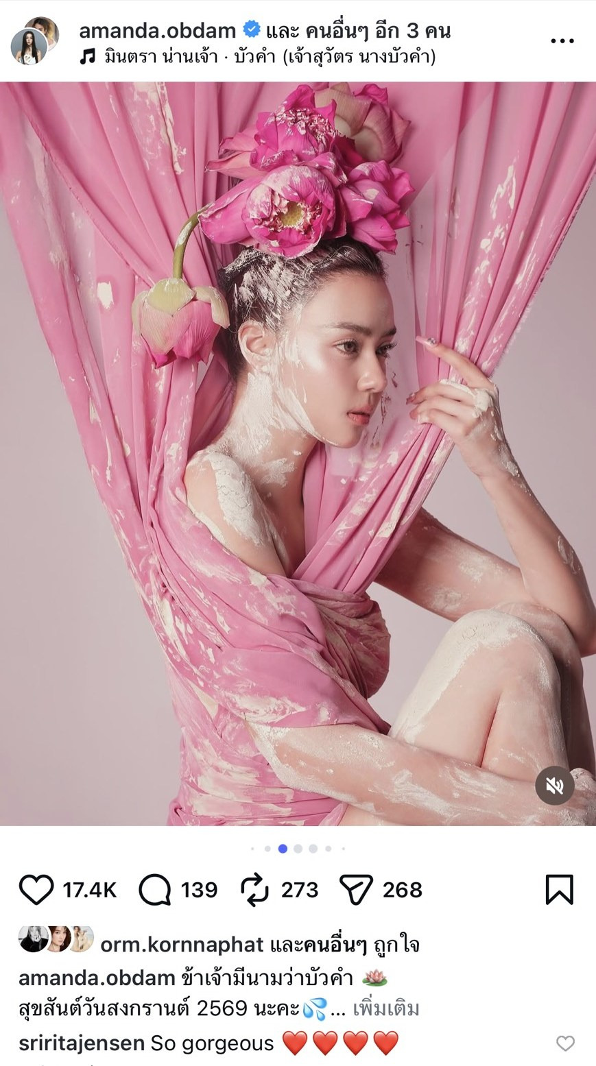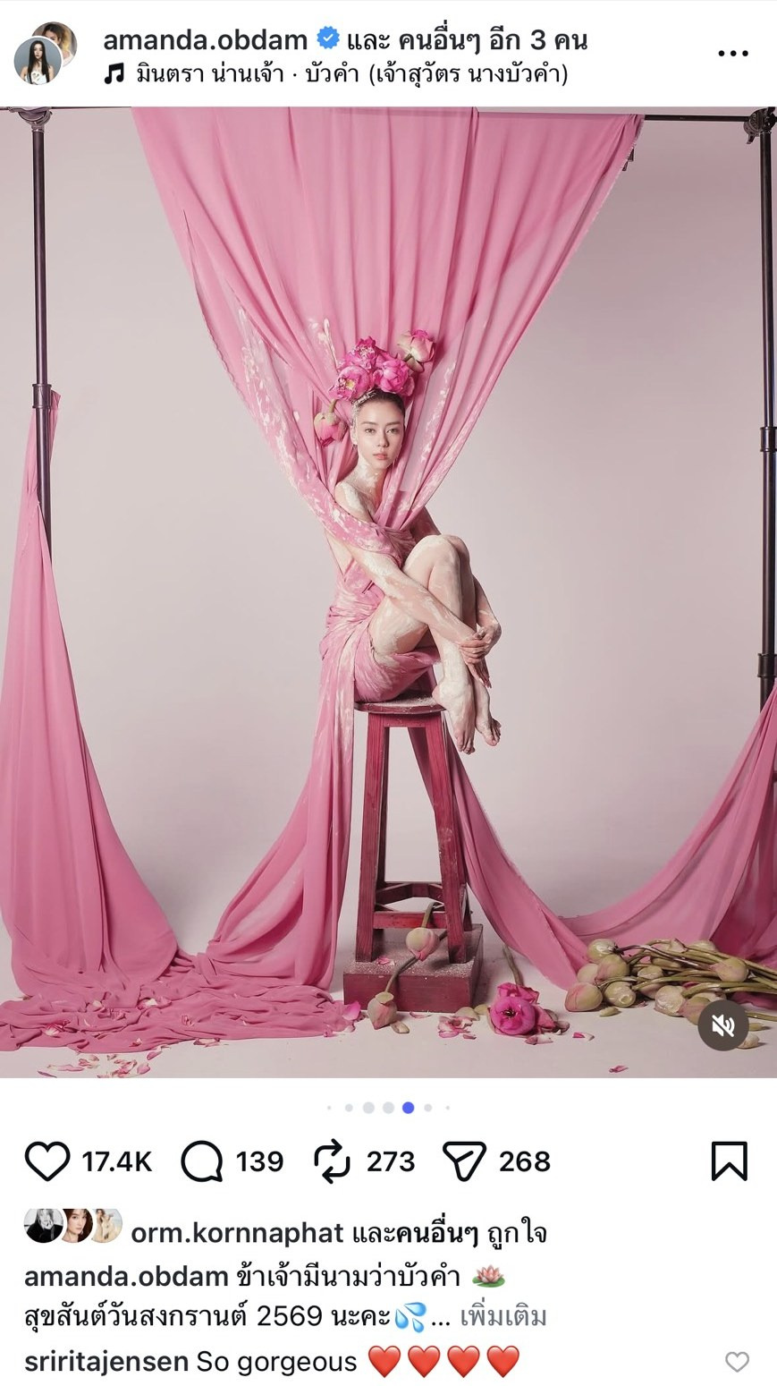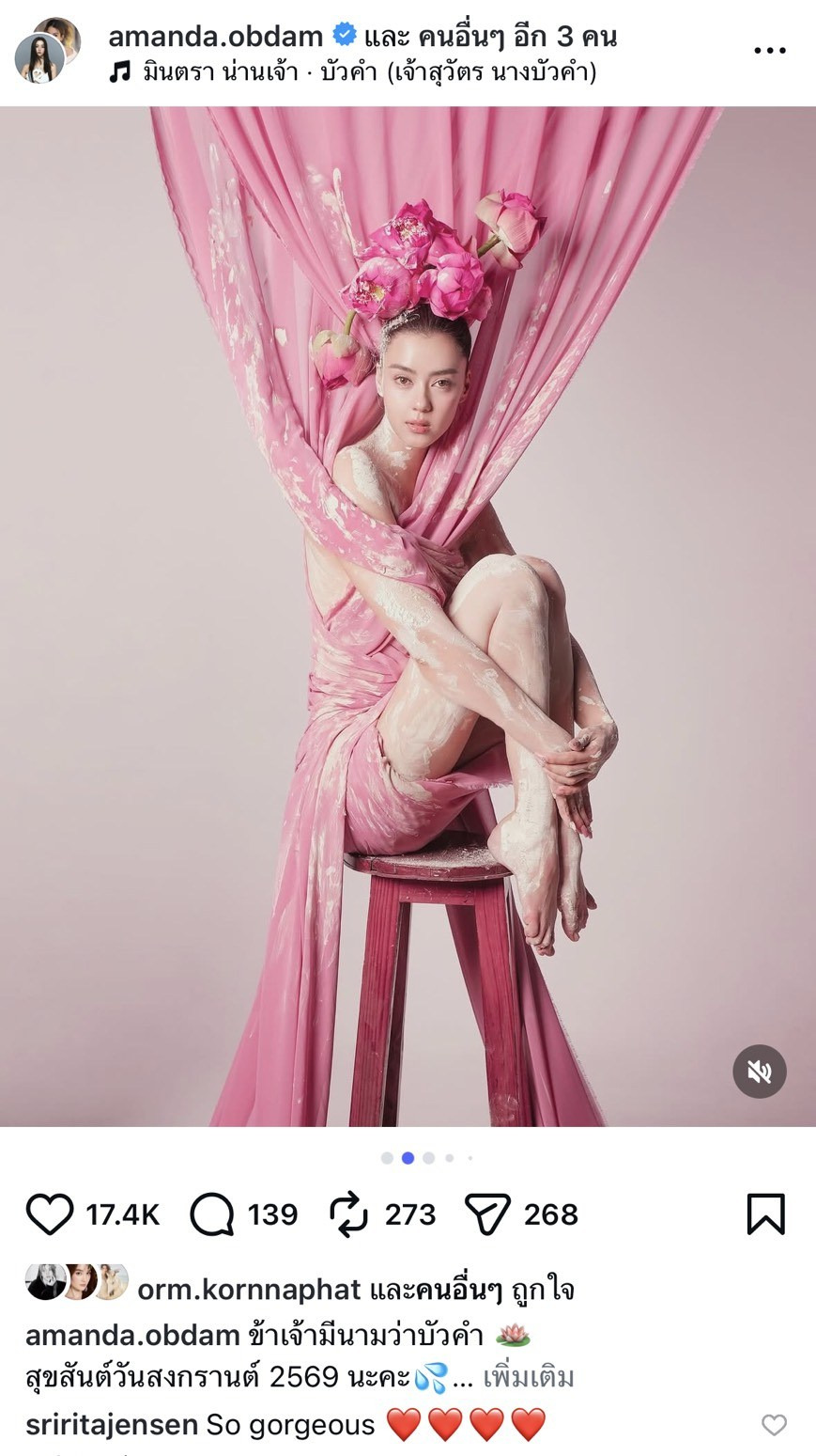 อแมนด้า ออปดัม (Amanda Obdam) สร้างเสียงฮือฮาอีกครั้งกับแฟชั่นเซตต้อนรับเทศกาลสงกรานต์ 2569 ในชื่อชุด "บัวคำ" โชว์ศิลปะการแต่งหน้าด้วยดินสอพองผสมผสานความอ่อนช้อยของดอกบัวสีชมพู พร้อมความหมายลึกซึ้ง แฟนคลับแห่คอมเมนต์ "สวยเกินต้าน"