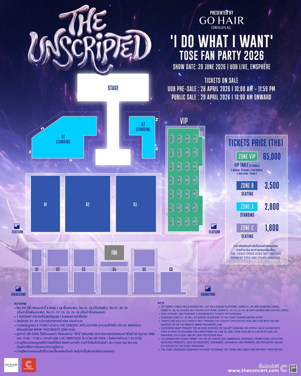 เตรียมตัวให้พร้อมและมาสัมผัสประสบการณ์ความสุขครั้งสำคัญที่เป็นมากกว่าคอนเสิร์ต ร่วมร้องเพลงฮิตในวันวานไปด้วยกัน ใน ‘TOSE FAN PARTY : THE UNSCRIPTED Presented by GO HAIR’ เปิดจำหน่ายบัตรรอบ UOB Pre-sale ในวันที่ 28 เมษายน 2569 เวลา 10.00 - 11.59 น. และรอบ Public Sale วันที่ 29 เมษายน 2569 เวลา 10.00 น. บัตรนั่งราคา 1,800 และ 3,500 บาท / บัตรยืนราคา 2,800 บาท และ Zone VIP 65,000 บาท จองบัตรให้พร้อมและมาสนุกไปด้วยกันวันที่ 20 มิถุนายน 2569 ณ UOB Live, Emsphere