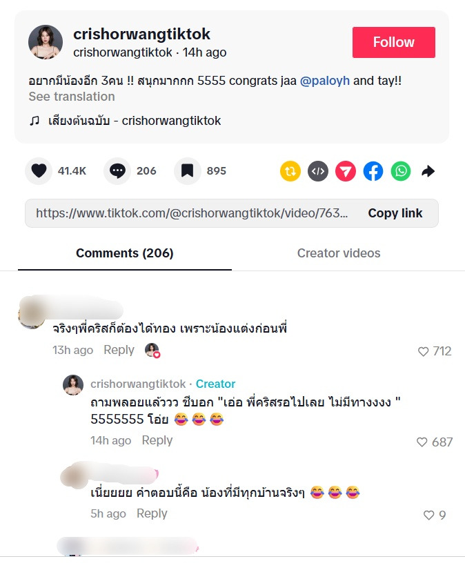 และมีชาวเน็ตมาคอมเมนต์ถามถึงเรื่องดังกล่าว ในติ๊กต็อก @ crishorwangtiktok ว่า...