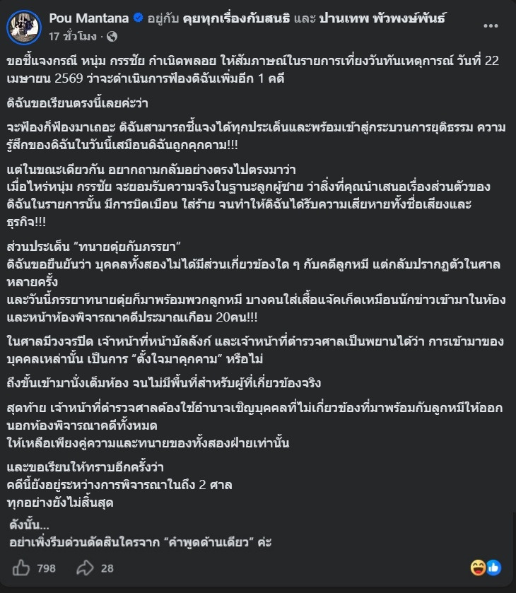 ขอชี้แจงกรณี หนุ่ม กรรชัย กำเนิดพลอย ให้สัมภาษณ์ในรายการเที่ยงวันทันเหตุการณ์ วันที่ 22 เมษายน 2569 ว่าจะดำเนินการฟ้องดิฉันเพิ่มอีก 1 คดี