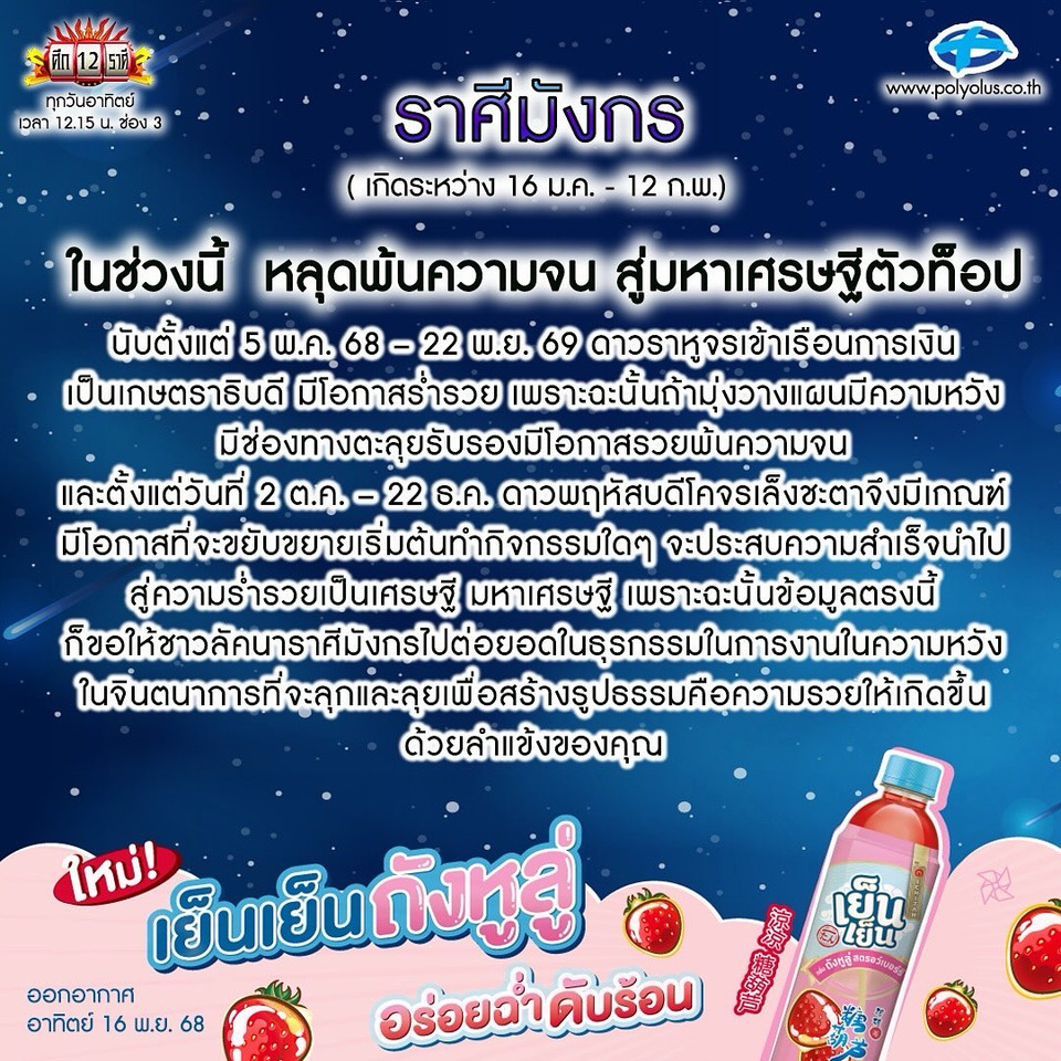 วันที่ 16 พ.ย.68 "ลักษณ์ ราชสีห์" หรือ "หมอลักษณ์ ฟันธง" นักพยากรณ์ชื่อดัง ทำนายดวงผ่านอินสตาแกรม @polyplus_jad_hai ระบุว่า ราศีมังกร ในช่วงนี้ หลุดพ้นความจน สู่มหาเศรษฐีตัวท้อป