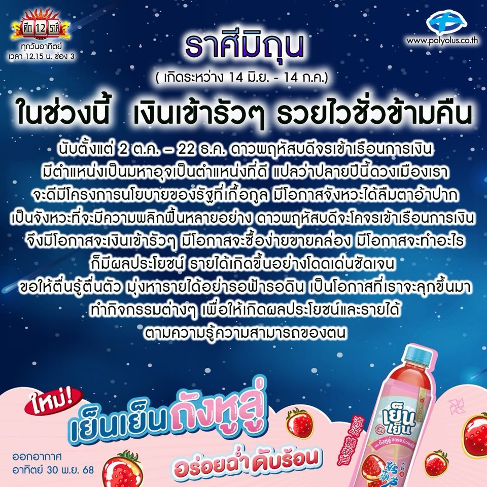 ดวงเงินเข้ารัวๆ! "หมอลักษณ์ฟันธง" ราศีใดรวยไวชั่วข้ามคืนแชร์ข่าววันที่ 30 พ.ย. 2568 "ลักษณ์ ราชสีห์" หรือ "หมอลักษณ์ ฟันธง" นักพยากรณ์ชื่อดัง ทำนายดวงผ่านอินสตาแกรม @polyplus_jad_hai ระบุว่า ราศีมิถุน ในช่วงนี้ เงินเข้ารัวๆ รวยไวชั่วข้ามคืน ข่าวแนะนำ"กู้ภัยคำหอม" จัดทอดผ้าป่าจัดซื้อรถพยาบาลเสริมทัพให้กู้ภัยข่าวภูมิภาคปภ.เร่งสูบระบายน้ำออกจากพื้นที่ท่วมขังในพื้นที่จังหวัดสตูล พร้อมช่วยผู้ประสบภัย 6 อำเภอ ข่าวภูมิภาคแม่ทัพกุ้ง" ลุยนำทัพลงแขกเกี่ยวข้าว! พร้อมให้กำลังใจเกษตรกรสู้ภัยน้ำท่วมข่าวภูมิภาค แห่เช็กอิน! ‘โรงเรียนหมอนทองวิทยา’ กระแสแรง บางน้ำเปรี้ยวคึกคักข่าวภูมิภาคTags:ศึก12ราศีหมอลักษณ์ฟันธงดวงราศึดวงวันนี้โหรลักษณ์ลักษณ์ราชสีห์แชร์ข่าว