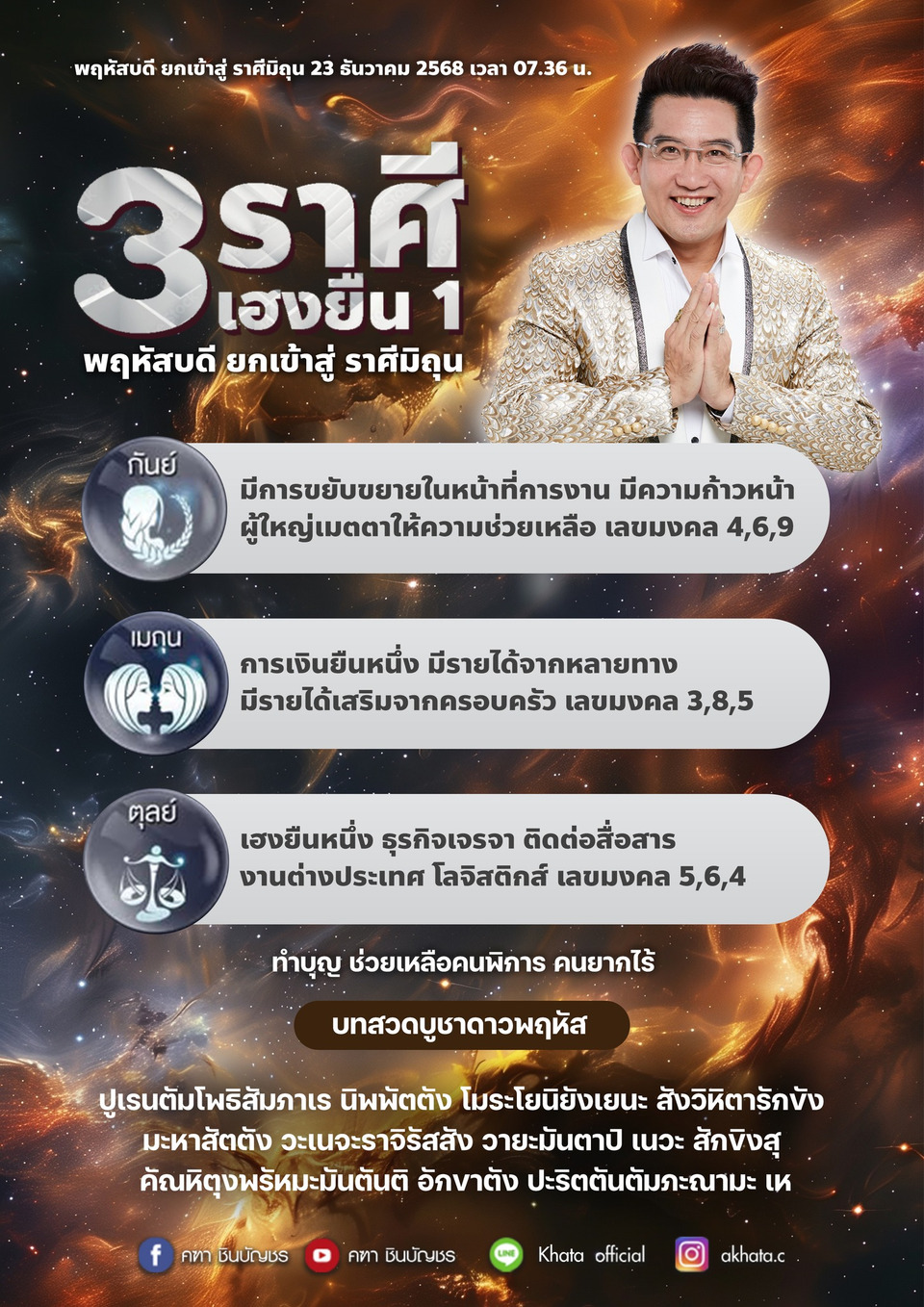 วันที่ 22 ธ.ค.68 อาจารย์คฑา ชินบัญชร นักพยากรณ์ชื่อดัง โพสต์ข้อความ ผ่านเฟซบุ๊ก "คฑา ชินบัญชร" ระบุว่า...