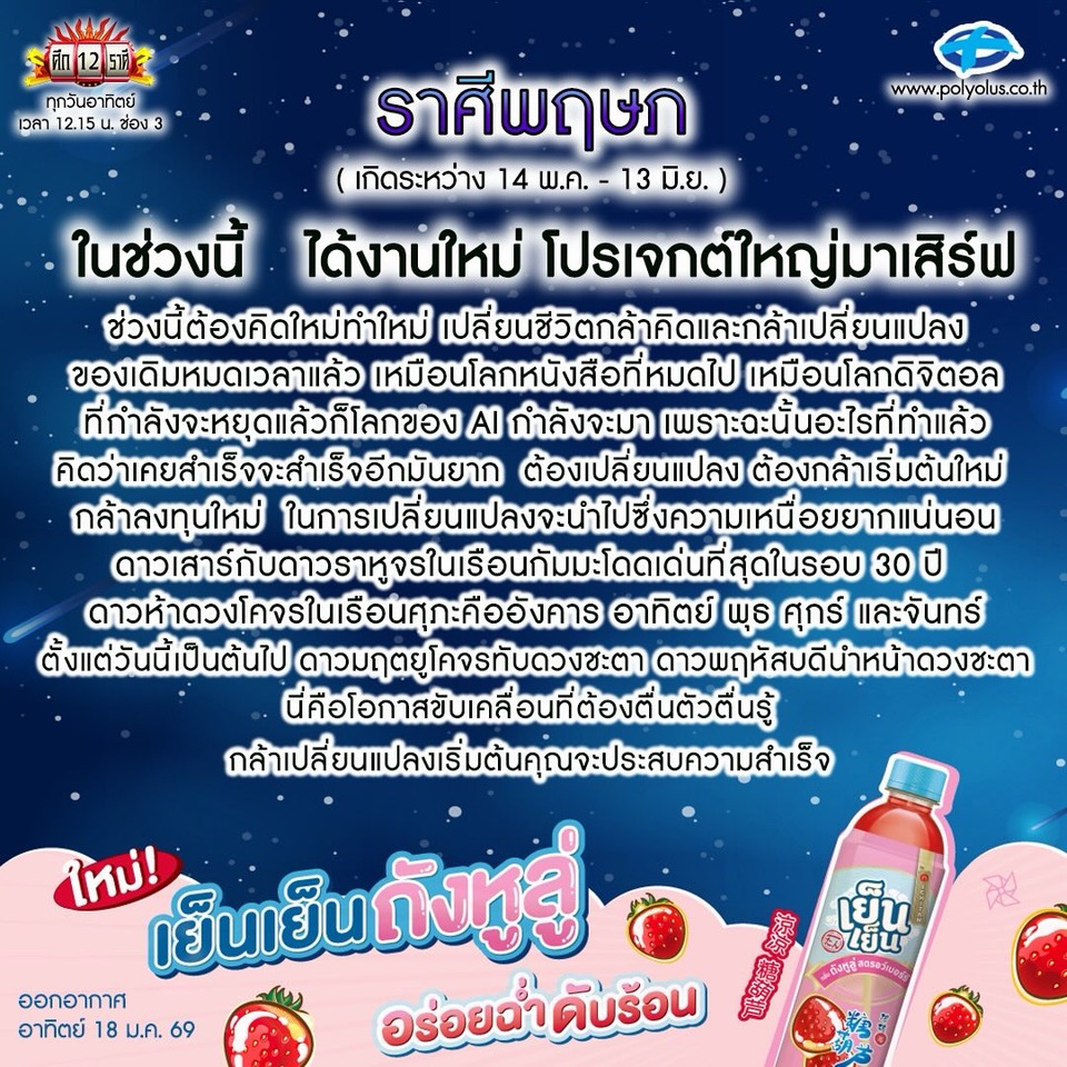 วันที่ 19 ม.ค.69 "ลักษณ์ ราชสีห์" หรือ "หมอลักษณ์ ฟันธง" หมอดูชื่อดังของเมืองไทย ทำนายราศีผ่านอินสตาแกรม @polyplus_jad_hai ระบุว่า...