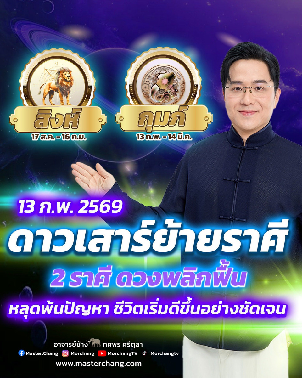 วันที่ 13 ก.พ.69 "หมอช้าง" หมอดูชื่อดังของเมืองไทย โพสต์ข้อความผ่านเพจเฟซบุ๊ก "หมอช้าง ทศพร ศรีตุลา" ระบุว่า...