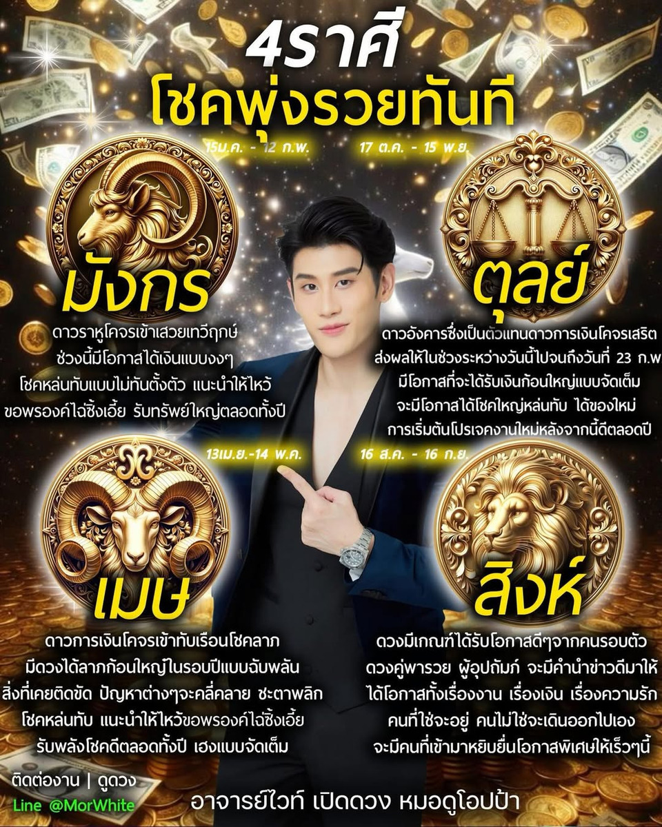 วันที่16 ก.พ.69 อาจารย์ไวท์ หมอดูโอปป้า นักพยากรณ์ชื่อดัง โพสต์ข้อความผ่านอินสตาแกรม whitejewel100 ระบุข้อความว่า 4ราศี โชคพุ่งรวยทันที