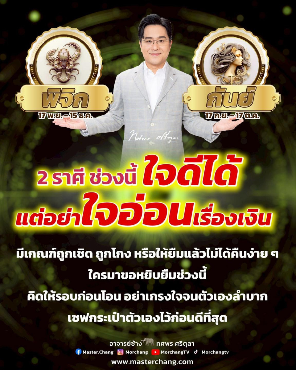 วันที่ 20 ก.พ.69 "หมอช้าง" นักพยากรณ์ชื่อดัง โพสต์ข้อความผ่านเพจเฟซบุ๊ก "หมอช้าง ทศพร ศรีตุลา" ระบุว่า พิจิก (17 พ.ย. - 15 ธ.ค.) กันย์ (17 ก.ย. - 17 ต.ค.) ... 2 ราศี ช่วงนี้ ใจดีได้ แต่อย่าใจอ่อนเรื่องเงิน มีเกณฑ์ถูกเชิด ถูกโกง หรือให้ยืมแล้วไม่ได้คืนง่าย ๆ ใครมาขอหยิบยืมช่วงนี้ คิดให้รอบก่อนโอน อย่าเกรงใจจนตัวเองลำบาก เซฟกระเป๋าตัวเองไว้ก่อนดีที่สุด