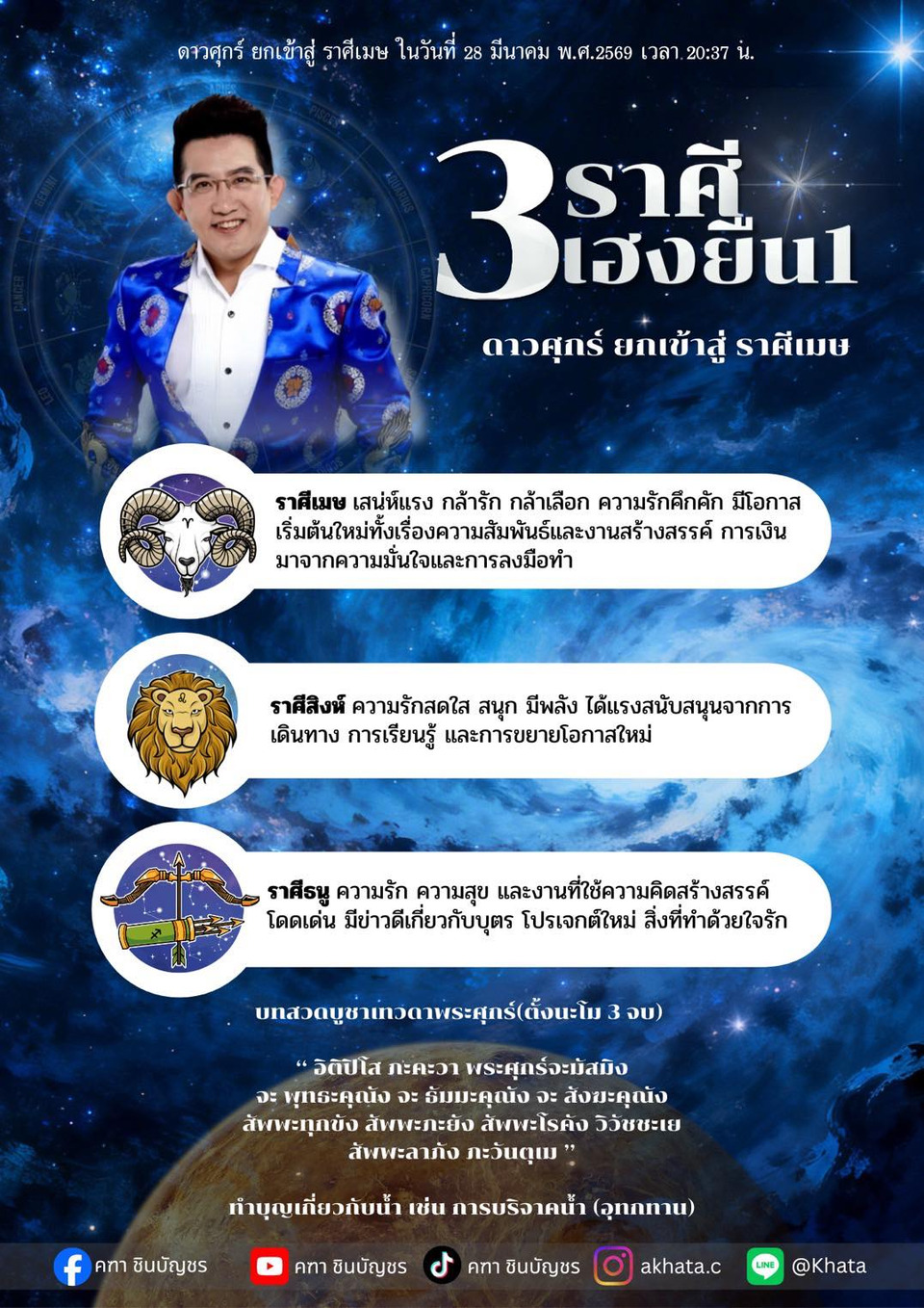 3 ราศี เฮงยืนหนึ่ง ในวันที่ 28 มีนาคม พ.ศ.2569 เวลา 20:37 น. ได้แก่