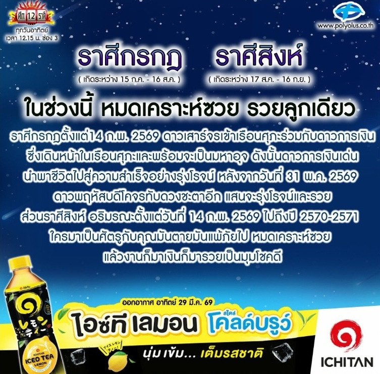 วันที่ 29 มี.ค..69 "ลักษณ์ ราชสีห์" หรือ "หมอลักษณ์ ฟันธง" นักพยากรณ์ชื่อดัง ทำนายดวงผ่านอินสตาแกรม @polyplus_jad_hai ระบุว่า ราศีกรกฏ - ราศีสิงห์ ในช่วงนี้ หมดเคราะห์ซวย รวยลูกเดียว