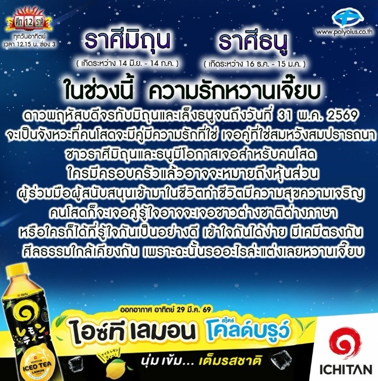 วันที่ 29 มี.ค..69 "ลักษณ์ ราชสีห์" หรือ "หมอลักษณ์ ฟันธง" นักพยากรณ์ชื่อดัง ทำนายดวงผ่านอินสตาแกรม @polyplus_jad_hai ระบุว่า ราศีมิถุน - ราศีธนู ในช่วงนี้ ความรักหวานเจี๊ยบ