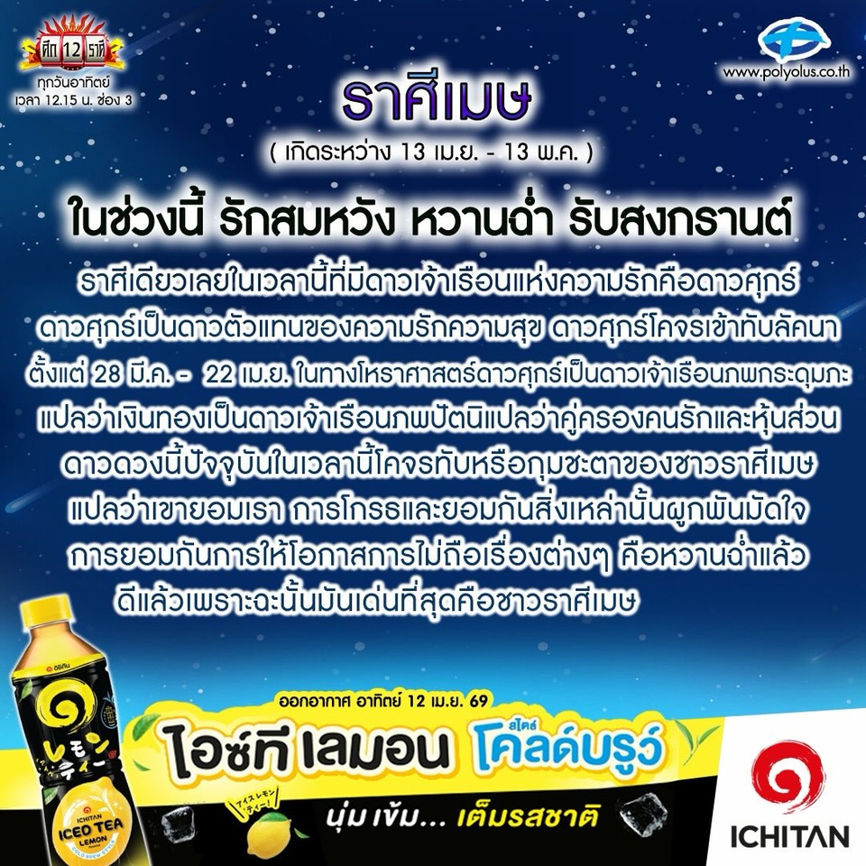 วันที่ 12 เม.ย.69 "ลักษณ์ ราชสีห์" หรือ "หมอลักษณ์ ฟันธง" หมอดูชื่อดังของเมืองไทย ทำนายราศีผ่านอินสตาแกรม @polyplus_jad_hai ระบุว่า...