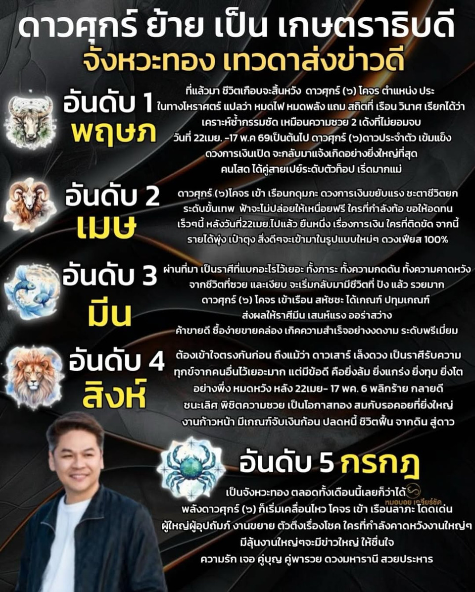 ดาวศุกร์(6) โคจร ย้าย ดำรงค์ตำแหน่ง เกษตราธิบดี วันที่ 22 เมษายน 69 เวลา 01.09 น.จังหวะทอง เทวดาส่งข่าวดี