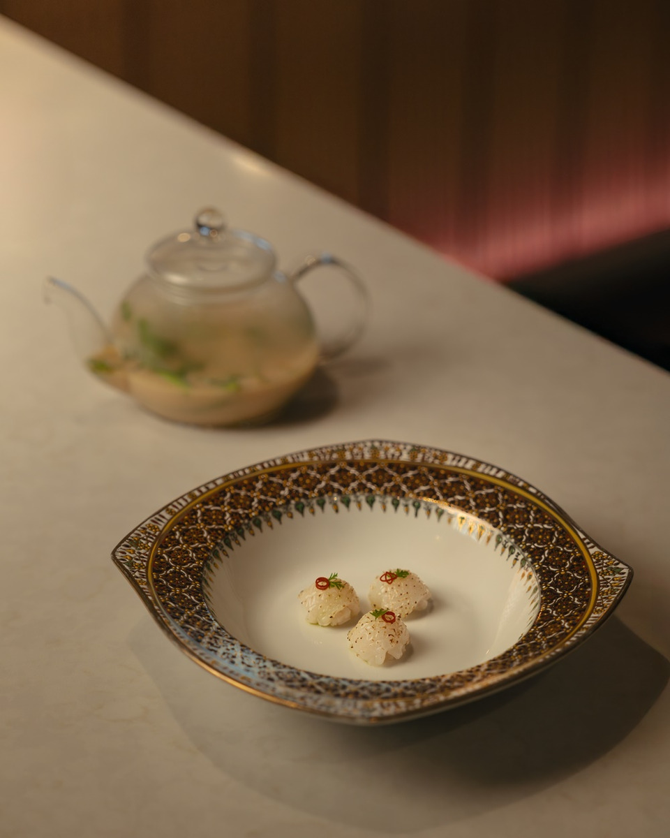 มื้อค่ำโดยเชฟป้อม ณ บ้านพระยา เริ่มต้นที่ชานของบ้าน โดยแขกจะได้รับการต้อนรับด้วย ม้าฮ่อ และ ขนมดอกจอก ม้าฮ่อผสานความเปรี้ยวของสับปะรดที่เชฟตีความออกมาเป็นแผ่นบางๆ เข้ากับไช้โป๊วหวานและถั่วลิสงคั่วเสิฟในหนึ่งคำ ส่วนขนมดอกจอกหอมด้วยกลิ่นจากส้มซ่า จับคู่กับมะขามและพริกเพื่อเพิ่มมิติของความกลมกล่อม หลังจากนั้น ใบเครือหมาน้อยสาหร่ายพวงองุ่น ของว่างชิ้นล้างปากเล็กๆ เสิร์ฟคู่กับคอมบูชาในโซนครัวเปิด ก่อนที่แขกจะถูกเชิญเข้าสู่ที่นั่งเพื่อเริ่มต้นมื้อค่ำ