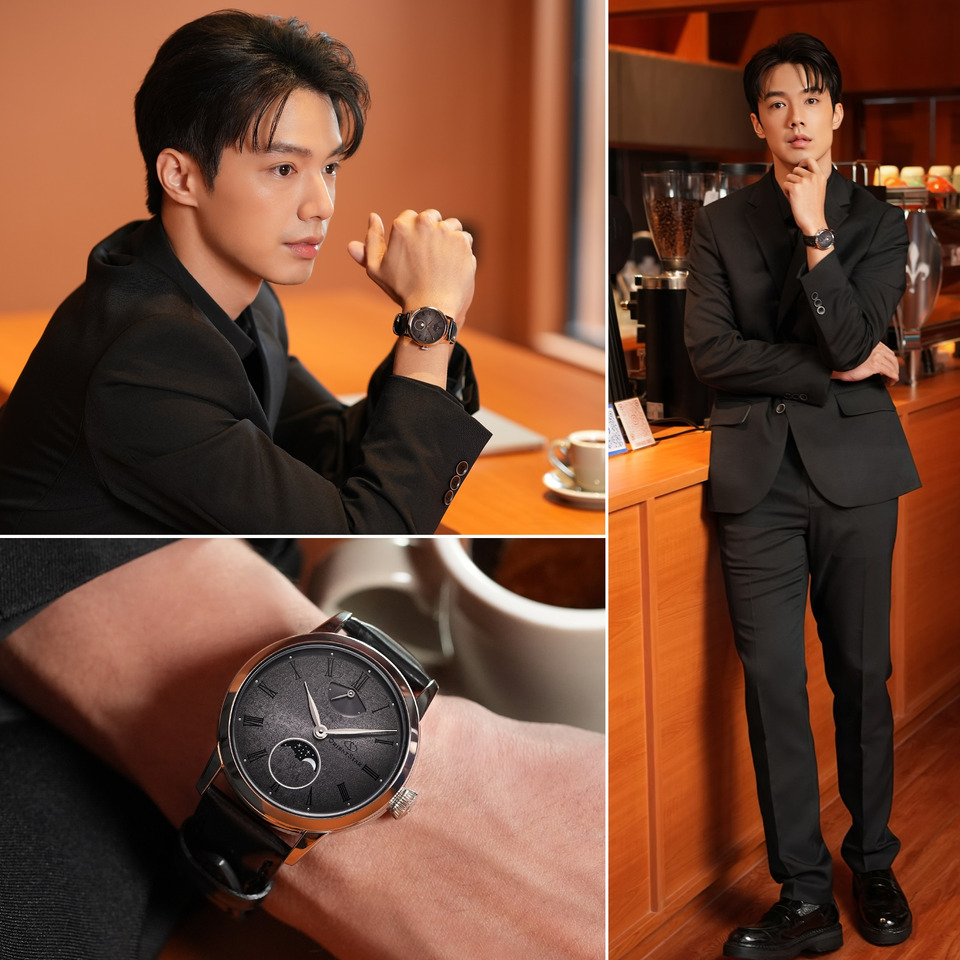 อย่างชุดที่หนุ่มจ๊อบจะเลือกใส่ก็คือ สไตล์ business casual สูทสีดำพอดีตัวคู่กับเสื้อเชิ้ตสีดำ และกางเกงสแล็คสีดำทรงเดฟที่ทำให้ดูสูงเพรียวคู่กับรองเท้าคัทชูหนังสีดำดูเรียบหรู แม้ชุดจะดูเรียบแต่ก็แฝงไว้ด้วยคัทติ้งที่ประณีตไม่ธรรมดา หนุ่มจ๊อบบอกว่า “เป็นดีไซน์ที่สะอาดตาแต่ซ่อนความซับซ้อนของรายละเอียดไว้อย่างชาญฉลาดเหมาะสำหรับคนที่มองหาแฟชั่นแบบที่ใส่ได้ทุกวัน แต่ยังคงความพิเศษในทุกชิ้น” ในส่วนของนาฬิกานั้นเป็นเรื่องที่หนุ่มจ๊อบจะให้ความสำคัญมากเป็นพิเศษเพราะส่วนตัวจะไม่ใช้เครื่องประดับเลย ฉะนั้นนาฬิกาข้อมือสำหรับเขาจึงเป็นเหมือนตัวแทนเครื่องประดับเพียงชิ้นเดียวที่ใส่อยู่บนตัว จึงต้องเลือกให้เข้ากับเสื้อผ้าและสะท้อนความเป็นตัวตนของเขาให้มากที่สุด อย่างนาฬิกา Orient Star รุ่น M45 F8 Mechanical Moon Phase Hand Winding ที่เขาเลือกใส่ในครั้งนี้ “เป็นนาฬิการุ่นใหม่ ลิมิเต็ดอิดิชั่นที่เหมาะมากกับชุดสูทของผม มองแล้วตรงกับแนวคิดในแบบ Minimal-multi อย่างที่ผมชอบ คือมีดีไซน์ที่ผสานความมินิมอลเข้ากับรายละเอียดที่ประณีต เส้นสายเรียบง่าย ความสมบูรณ์แบบของงานฝีมือที่ทุกองค์ประกอบจะสะท้อนความหรูหราและความเรียบง่ายแต่แฝงด้วยรายละเอียดที่โดดเด่นไว้ในเวลาเดียวกัน ช่วยให้ความเป็นเดรสนั้นสมบูรณ์แบบมากยิ่งขึ้น” หนุ่มจ๊อบกล่าว