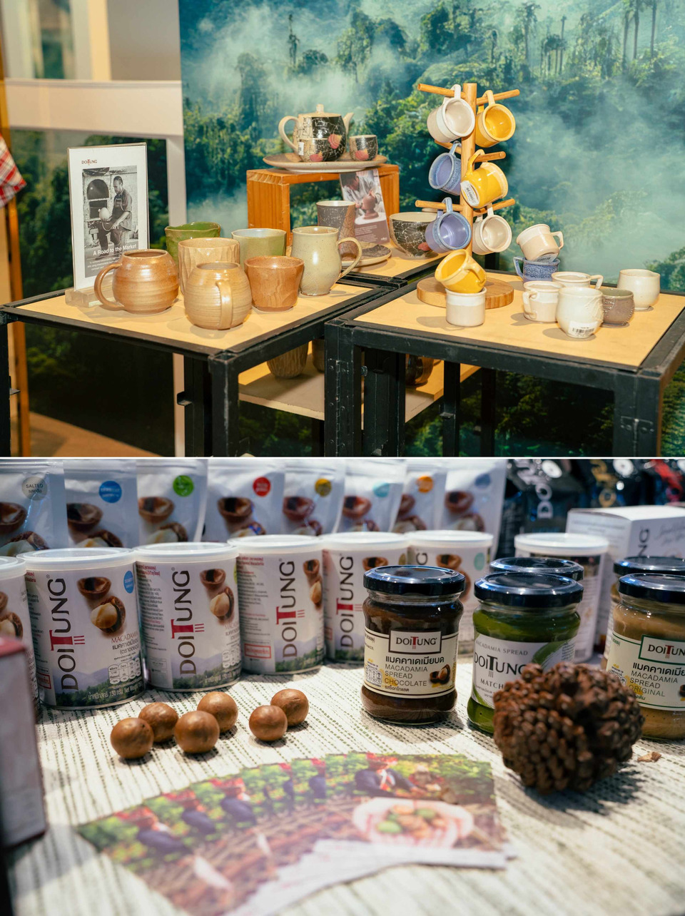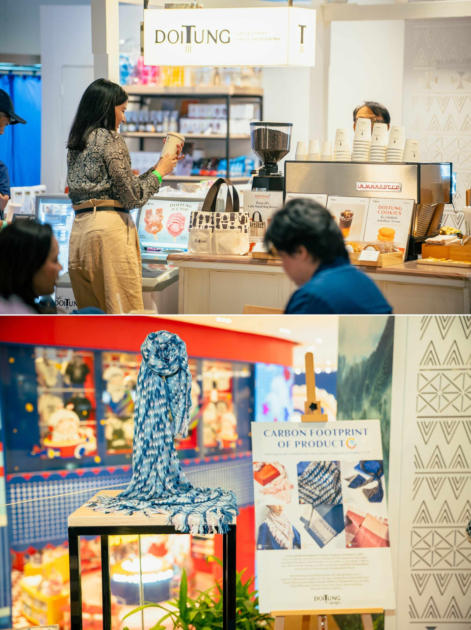 โซนที่ 2 ดอยตุง ป๊อปอัพ สโตร์ ที่ขนผลิตภัณฑ์ที่ผลิตอย่างยั่งยืนมาให้ได้เลือกชิมเลือกช็อปไม่ว่าจะเป็นกาแฟที่ปลูกใต้ร่มไม้ที่ยกมาทั้งคาเฟ่ แมคคาเดเมียและผลิตภัณฑ์แปรรูป ต้นไม้หลากหลายพันธุ์ สินค้าหัตถกรรมผ้าทอมือที่ต่อยอดเป็นเสื้อผ้า กระเป๋า และของใช้ในบ้านร่วมสมัย ตลอดจนเครื่องปั้นดินเผา ที่มาพร้อมเรื่องเล่าจากกระบวนการผลิตที่ใส่ใจสิ่งแวดล้อม อาทิ การใช้สีจากธรรมชาติ และการนำเส้นใยรีไซเคิลจากขวดพลาสติกมาทอเป็นพรม