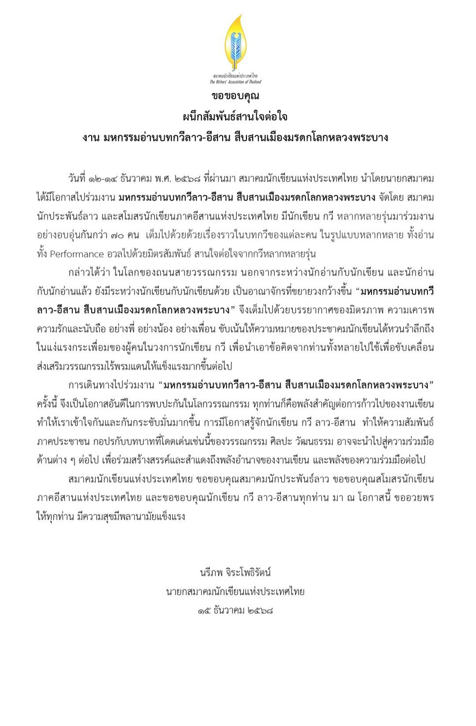 ในโอกาสนี้ สมาคมนักเขียนแห่งประเทศไทยได้กล่าวขอบคุณอย่างสุดซึ้งต่อสมาคมนักประพันธ์ลาว สโมสรนักเขียนภาคอีสานแห่งประเทศไทย รวมถึงนักเขียนและกวีลาว-อีสานทุกท่านที่มาร่วมงาน และขออวยพรให้ทุกท่านมีความสุข มีพลานามัยแข็งแรง