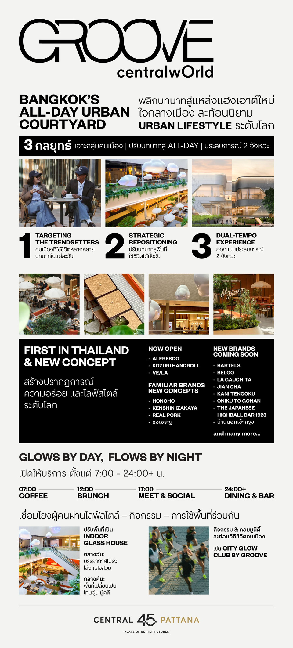 ออกแบบประสบการณ์ 2 จังหวะ (Dual-Tempo Experience) รองรับไลฟ์สไตล์คนเมืองด้วย 2 บรรยากาศหลัก ตั้งแต่ช่วงเช้า-เย็น เน้นกิจกรรมแอคทีฟ และการดูแลสุขภาพ พร้อมสร้างคอมมูนิตี้ของคนที่มีไลฟ์สไตล์ใกล้เคียงกัน ไปจนถึงช่วงกลางคืน ที่ยังคงเอกลักษณ์ความสนุกของ Groove ในรูปแบบที่ยกระดับขึ้น