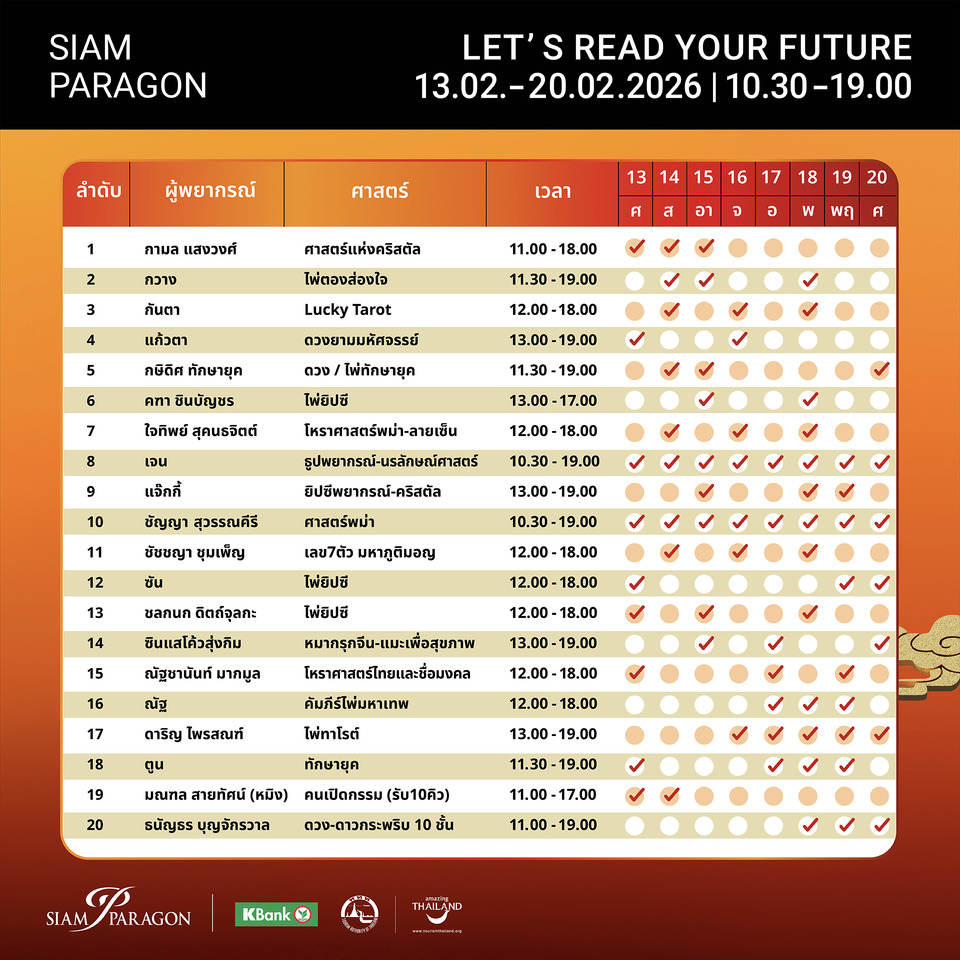 ผู้สนใจเข้ารับการพยากรณ์สามารถซื้อบัตรพยากรณ์แบบวันต่อวันในราคาใบละ 400 บาท ที่บริเวณงาน “สิริวัฒนาพยากรณ์ เพื่อคนพิการ” ระหว่างวันที่ 13-20 กุมภาพันธ์ 2569 นี้ ณ คริสตัล คอร์ท ชั้น 2 (ฝั่งนอร์ท) สยามพารากอน สอบถามข้อมูลเพิ่มเติมติดต่อโทร.065-864-5943 (10.30-19.00) หรือติดตามรายละเอียดเพิ่มเติมได้ที่ Facebook: SIAMPARAGON