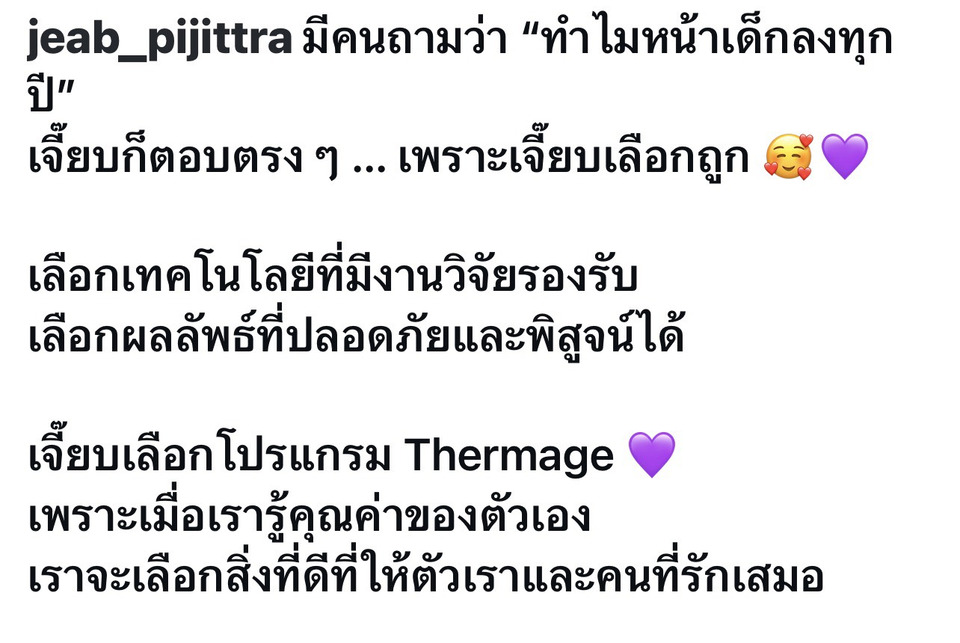ล่าสุดเจ้าตัวออกมาเปิดใจแบบไม่มีกั๊ก บอกเลยว่าสูตรลับของ เจี๊ยบ คือการ “เลือกให้ถูก” ทั้งการดูแลผิวด้วยเทคโนโลยีที่มีงานวิจัยรองรับ เน้นความปลอดภัยและผลลัพธ์ที่พิสูจน์ได้ พร้อมใส่ใจรายละเอียดเล็กๆ น้อยๆ ในชีวิตประจำวัน ทั้งการพักผ่อนให้เพียงพอ ดื่มน้ำเยอะ ๆ และดูแลสุขภาพจากภายใน