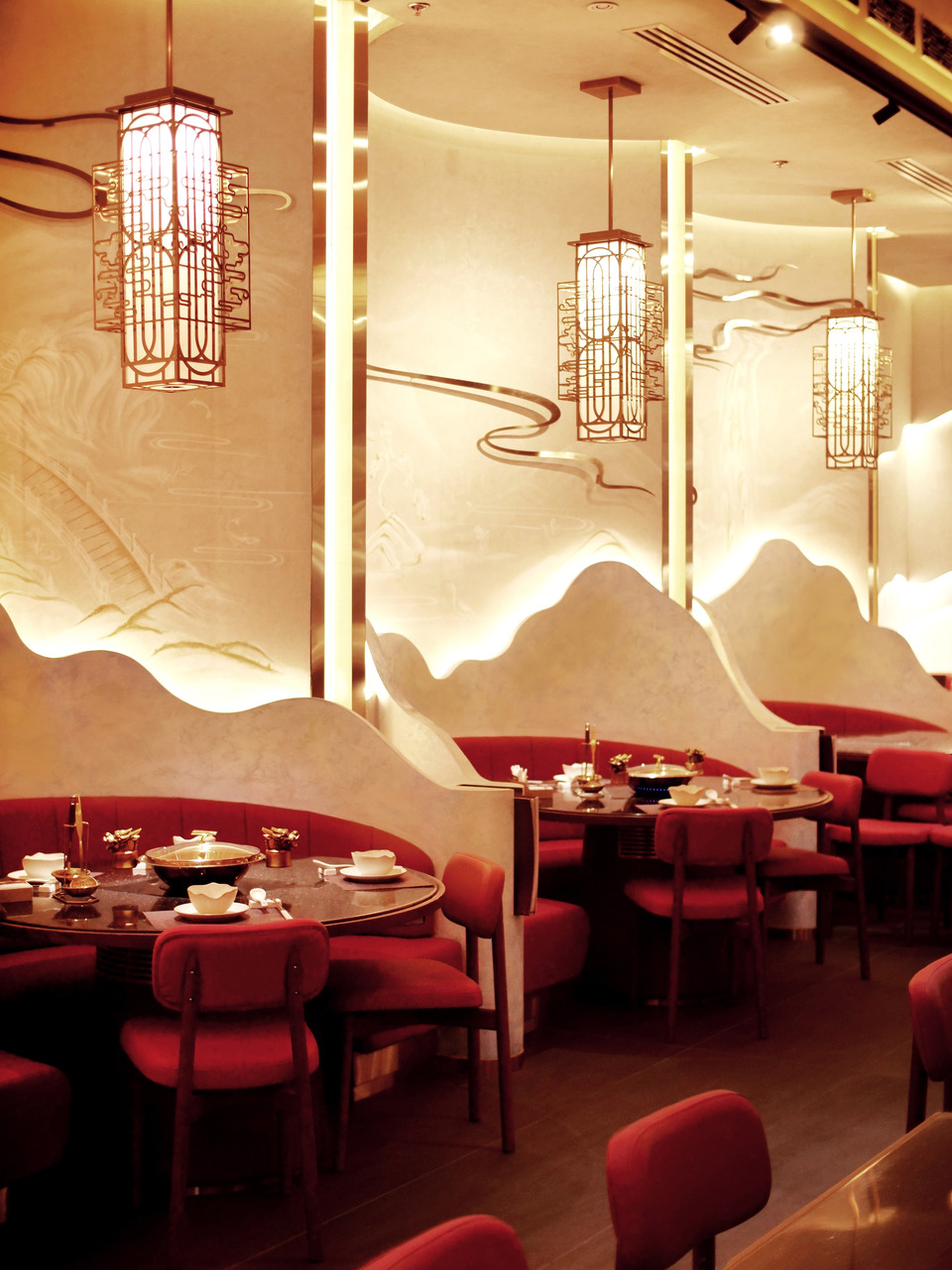 ด้านการออกแบบภายในร้านสะท้อนตำนานและความประณีตของแบรนด์ผ่านโทนสีทองและแดงที่สื่อถึงความพรีเมียม จุดเด่นกลางร้านเป็น Modern Art Installation ที่ได้แรงบันดาลใจจากเส้นบะหมี่หยก ผสมผสานกับลวดลายของทิวเขาบนผนัง เพดานออกแบบโค้งมนคล้ายเมฆบนท้องฟ้า