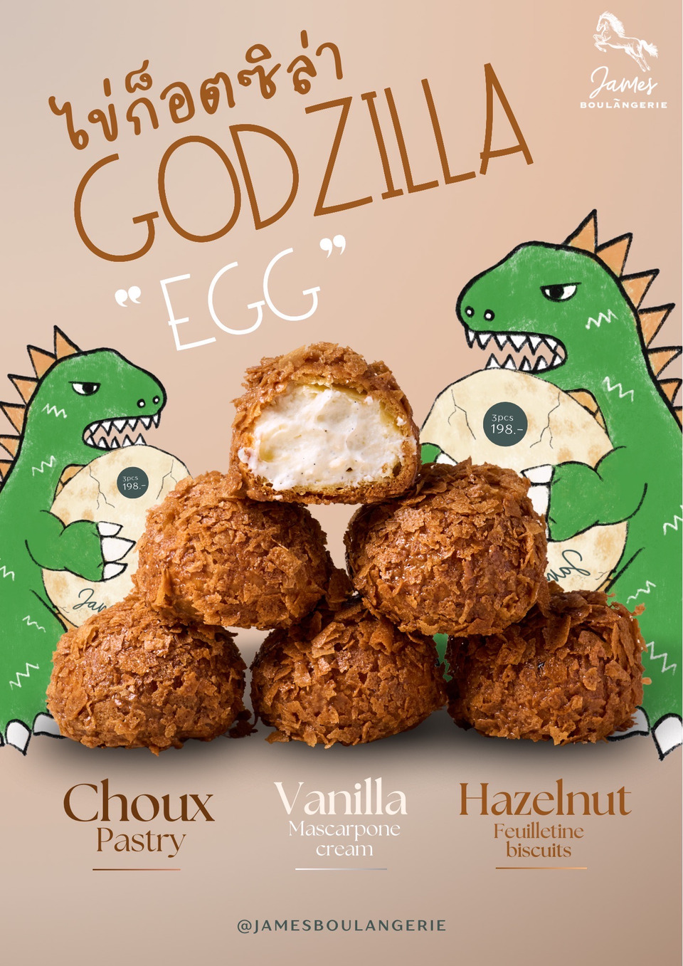 เมนูแรกคือ Godzilla Egg ขนมดีไซน์สะดุดตาที่โดดเด่นด้วยเนื้อสัมผัสหลายเลเยอร์ ด้านนอกเคลือบด้วย Feuilletine แผ่นบางกรุบกรอบ ส่วนด้านในเป็น Choux Pastry สอดไส้ครีม Chantilly Mascarpone เนื้อเบานุ่ม หอมกลิ่น Hazelnut Praline ให้ความรู้สึกทั้งกรอบ นุ่ม และครีมมี่ในคำเดียว