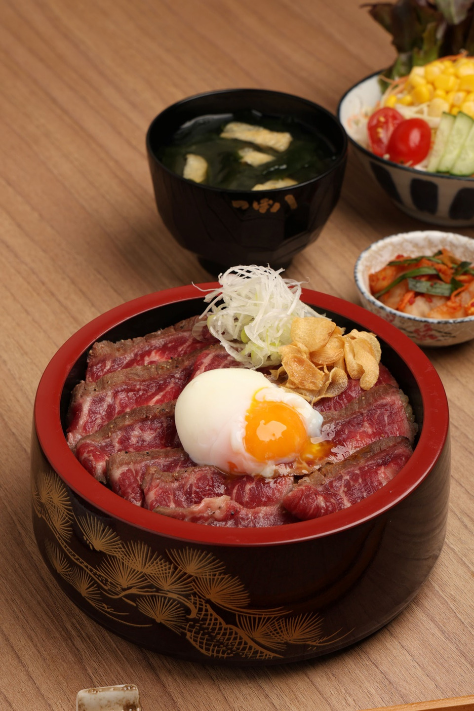 ชุดข้าวหน้าสเต๊กเนื้อ และไข่ออนเซ็น สเต๊กเนื้อคุณภาพดี ย่างจนหอมกรุ่น เลือกความสุกได้ตามชอบ ทานคู่กับไข่ออนเซ็นเยิ้มๆ เพิ่มความละมุน