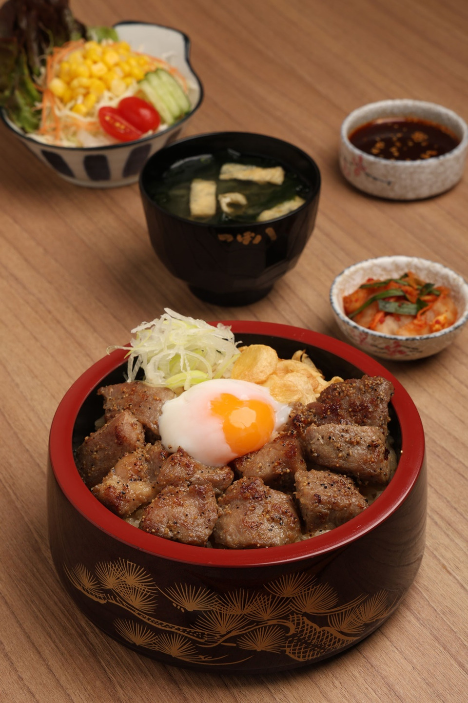 ชุดข้าวหน้าสเต๊กหมู และไข่ออนเซ็น หมูคุโรบูตะชิ้นหนานุ่ม ย่างซอสรสเข้มข้นจนขึ้นเงา เสิร์ฟคู่ไข่ออนเซ็น เป็นเมนูขวัญใจสายเนื้อหมู