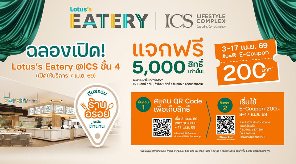 ไอซีเอสและ Lotus’s Eatery ได้จัดแคมเปญพิเศษ เพื่อฉลองการเปิดตัว โดยมอบคูปองรับประทานอาหารฟรี! มูลค่า 200 บาท รวมทั้งสิ้น 5,000 สิทธิ์ มูลค่ารวม 1,000,000 บาท (จำกัด 500 สิทธิ์ต่อวัน และ 1 สิทธิ์ต่อสมาชิกวันสยาม) เพียงกดรับสิทธิ์ผ่าน ONESIAM SuperApp ระหว่างวันที่ 3 – 17 เมษายน 2569 หรือจนกว่าจำนวนสิทธิ์จะหมด (เริ่มกดรับสิทธิ์วันแรก 3 เม.ย. 2569 เวลา 10.00 น.) และท่านที่ได้รับสิทธิ์สามารถนำคูปองมาแลก การ์ด Lotus’s Eatery เพื่อใช้สิทธิ์ทานอาหารฟรีได้ตามวันที่ระบุในคูปองเท่านั้น เริ่มใช้คูปองได้ตั้งแต่วันที่ 8 – 17 เมษายน 2569