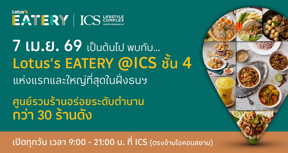 “สำหรับปี 2569 นี้ ไอซีเอสได้ร่วมมือกับพันธมิตรสำคัญ บริษัท ซีพี แอ็กซ์ตร้า จํากัด (มหาชน) ซึ่งเป็นหนึ่งในผู้นำธุรกิจ Food Retail ระดับประเทศ เปิดตัว Lotus’s Eatery ศูนย์รวมร้านอาหารดังอร่อยระดับตำนานกว่า 30 ร้าน ที่ชั้น 4 พร้อมกับเพิ่มร้านค้าในโซน Grab & Go ที่ชั้น G เพื่อตอบรับพฤติกรรมผู้บริโภคยุคเร่งรีบ ด้วยอาหารและเครื่องดื่มคุณภาพที่คุ้มค่า สะดวก รวดเร็ว และเข้าถึงง่าย เสริมความครบครันของข้อเสนอด้านอาหาร และต่อยอดสู่การเป็นจุดหมายด้าน Food Destination แห่งใหม่ของฝั่งธนบุรี