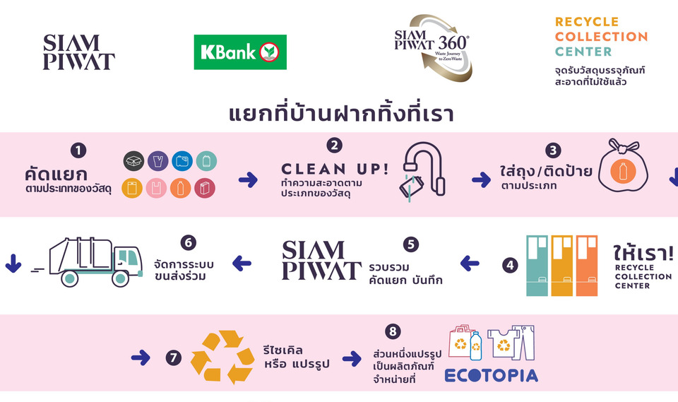 สำหรับความร่วมมือโดยการผนึกกำลังระหว่างสยามพิวรรธน์ และธนาคารกสิกรไทย (KBank) ในการพัฒนาความยั่งยืน ภายใต้โครงการ Siam Piwat 360° Waste Journey to Zero Waste ถือเป็นอีกก้าวของการสร้างความยั่งยืนด้านสิ่งแวดล้อม โดยนำแนวคิดเศรษฐกิจหมุนเวียน (Circular Economy) มาใช้จริง เพื่อบริหารจัดการทรัพยากรให้คุ้มค่าและลดการสร้างขยะให้มากที่สุด โครงการนี้ไม่ได้เป็นเพียงแค่การรณรงค์ แต่คือการสร้าง 'ต้นแบบ' การจัดการขยะแบบครบวงจรที่ส่งเสริมพฤติกรรมรักษ์โลกของคนไทยอย่างมีประสิทธิภาพ ซึ่งความสำเร็จนี้เกิดขึ้นได้จากพลังความร่วมมือจากองค์กรพันธมิตรหลายภาคส่วน อาทิ กรุงเทพมหานคร สำนักงานเขตปทุมวัน กรมควบคุมมลพิษ รวมทั้ง ร้านค้าผู้เช่าภายในศูนย์การค้าของกลุ่มสยามพิวรรธน์ ที่ต่างสนับสนุนให้ความร่วมมือในโครงการเป็นอย่างดี