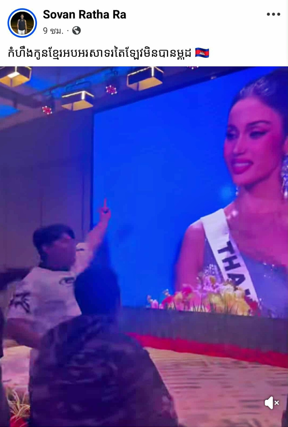 อีกด้านหนึ่ง มีคลิปจากแฟนเพจนางงามกัมพูชาที่กำลังเป็นไวรัล โดยผู้ใช้เฟซบุ๊ก Sovan Ratha Ra เผยภาพบรรยากาศการชมถ่ายทอดสดในกัมพูชา เมื่อประกาศว่าประเทศไทยได้เพียงรอง 1 แฟนนางงามกัมพูชา รวมถึงทีมงานและคุณแม่ของ เนียรี โสเจียตา ไท มิสยูนิเวิร์สกัมพูชา ต่างแสดงความดีใจกันอย่างออกหน้าออกตา บางคนถึงขั้ยชูนิ้วกลางใส่ภาพของวีนาที่ปรากฏบนจอ ... งานนี้ชาวเน็ตไทยไม่พลาด บุกคอมเมนต์แบบทัวร์ลงกันสนั่นโซเชียล