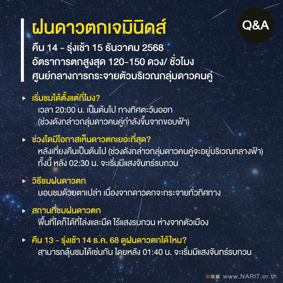 "ฝนดาวตกเจมินิดส์" หรือ ฝนดาวตกกลุ่มดาวคนคู่ จะเกิดในช่วงระหว่างวันที่ 4 - 20 ธันวาคม ของทุกปี มีศูนย์กลางการกระจายตัวบริเวณ #กลุ่มดาวคนคู่ ปีนี้นักดาราศาสตร์คาดการณ์ว่าจะมีอัตราการตกสูงสุดที่ประมาณ 120-150 ดวง/ ชั่วโมง สามารถรับชมความสวยงามได้ในคืนวันที่ 14 ถึงรุ่งเช้า 15 ธันวาคม 2568 ตามเวลาประเทศไทย