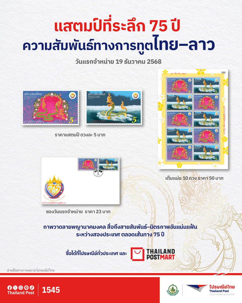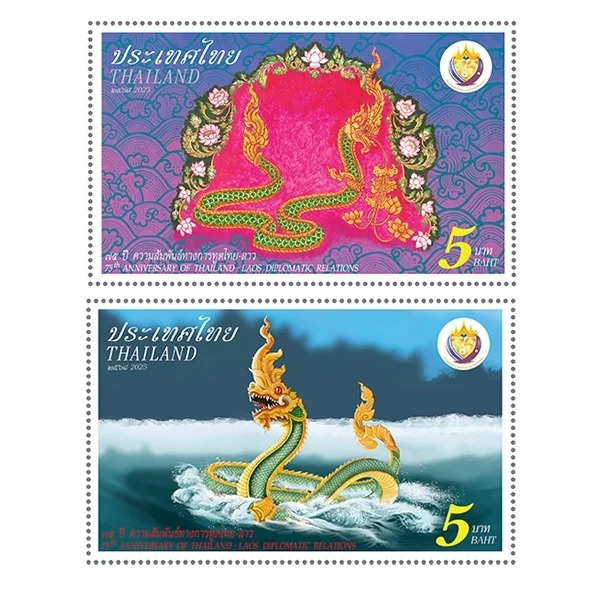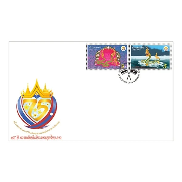 บริษัท ไปรษณีย์ไทย จำกัด เปิดจำหน่าย แสตมป์ที่ระลึก “75 ปี ความสัมพันธ์ทางการทูตไทย–ลาว” เพื่อเฉลิมฉลองวาระครบรอบความสัมพันธ์ทางการทูตระหว่างราชอาณาจักรไทยและสาธารณรัฐประชาธิปไตยประชาชนลาว ผ่านการออกแบบโดยไปรษณีย์ไทย และไปรษณีย์ลาว ได้แก่ 1.พญาศรีสัตตนาคราช 2.พญานาคในตระกูลวิรูปักษ์สีทอง สะท้อนความร่วมมือด้านการออกแบบและการแลกเปลี่ยนทางวัฒนธรรมของทั้งสองประเทศอย่างชัดเจน โดยแสตมป์ชุดนี้จำหน่ายในราคาดวงละ 5 บาท 1 แผ่นมี 10 ดวง ซองวันแรกจำหน่ายราคา 23 บาท สามารถซื้อได้ที่พิพิธภัณฑ์แสตมป์ไทย อาคารปฏิบัติการไปรษณีย์สามเสนใน (BTS สะพานควาย) ไปรษณีย์ในกรุงเทพฯ ไปรษณีย์จังหวัด หรือซื้อทางออนไลน์ที่เว็บไซต์ และแอปพลิเคชัน ThailandPostMart ตั้งแต่วันที่ 19 ธันวาคม 2568 เป็นต้นไป
