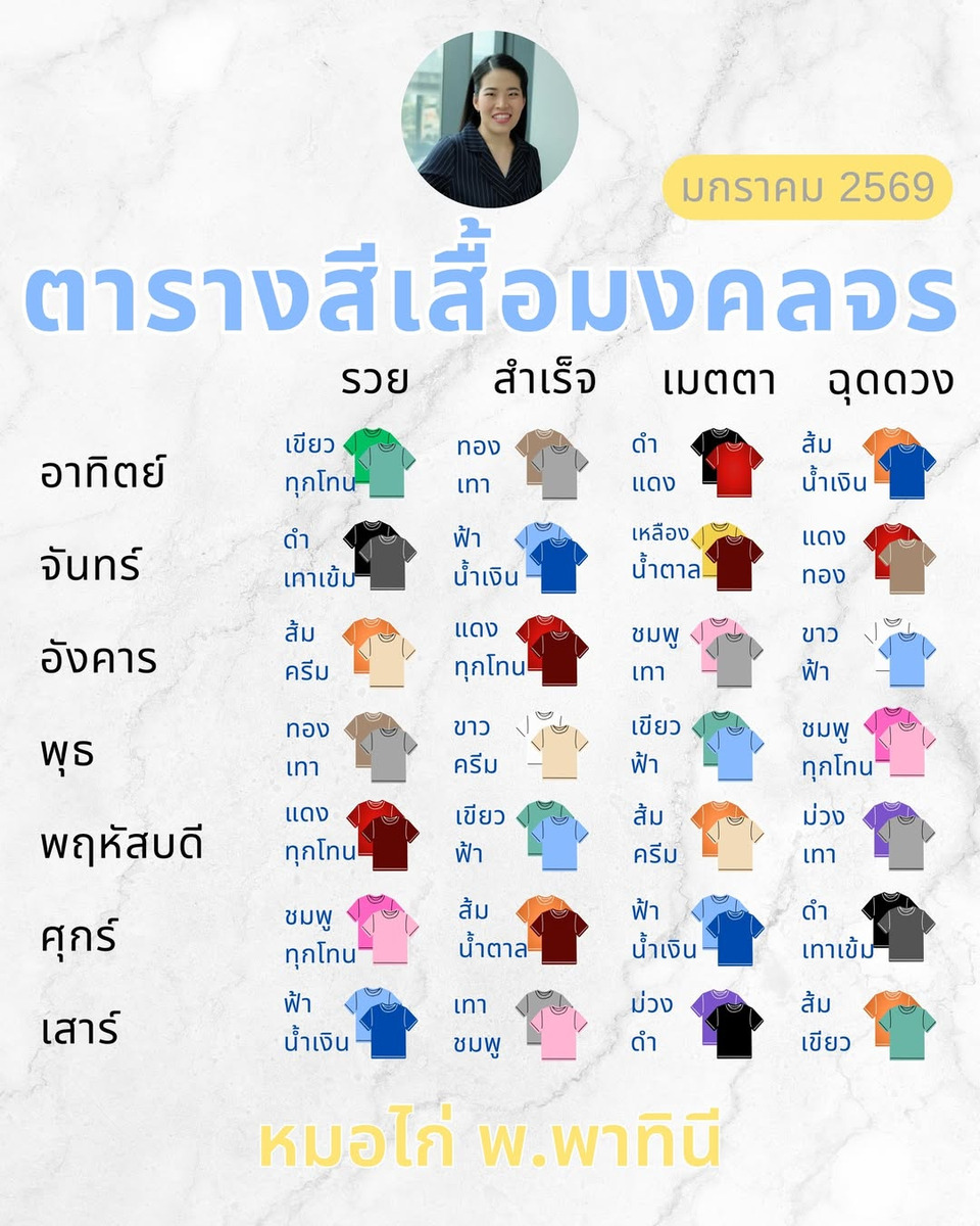 มาแล้วจ้า !! ตารางสีเสื้อมงคล เดือนมกราคม โดย หมอไก่ พ.พาทินี เน้นใส่ในวันสำคัญ ๆ เป็นหลัก จะเกิดสิ่งดี ๆ ตามมาอย่างแน่นอน