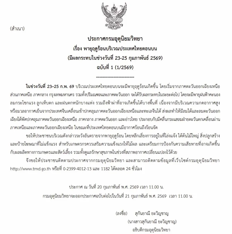 วันที่ 20 กุมภาพันธ์ พ.ศ. 2569 นางสาวสุกันยาณี ยะวิญชาญอธิบดีกรมอุตุนิยมวิทยา ออกประกาศกรมอุตุนิยมวิทยา เรื่อง พายุฤดูร้อนบริเวณประเทศไทยตอนบน (มีผลกระทบในช่วงวันที่ 23-25 กุมภาพันธ์ 2569) ฉบับที่ 1 (1/2569) ว่า ในช่วงวันที่ 23–25 ก.พ. 69 บริเวณประเทศไทยตอนบนจะมีพายุฤดูร้อนเกิดขึ้น โดยเริ่มจากภาคตะวันออกเฉียงเหนือ ส่วนภาคเหนือ ภาคกลาง กรุงเทพมหานคร รวมทั้งปริมณฑลและภาคตะวันออก จะได้รับผลกระทบในระยะต่อไป โดยจะมีพายุฝนฟ้าคะนอง ลมกระโชกแรง ลูกเห็บตก และฝนตกหนักบางแห่ง รวมถึงฟ้าผ่าที่อาจเกิดขึ้นได้บางพื้นที่ เนื่องจากมีบริเวณความกดอากาศสูงหรือมวลอากาศเย็นจากประเทศจีนเคลื่อนเข้าปกคลุมภาคตะวันออกเฉียงเหนือและทะเลจีนใต้ ส่งผลทำให้มีลมใต้และลมตะวันออกเฉียงใต้พัดปกคลุมภาคตะวันออกเฉียงเหนือ ภาคกลาง ภาคตะวันออก และอ่าวไทย ประกอบกับมีคลื่นกระแสลมฝ่ายตะวันตกเคลื่อนผ่านภาคเหนือและภาคตะวันออกเฉียงเหนือ ในขณะที่ประเทศไทยตอนบนมีอากาศร้อนถึงร้อนจัด