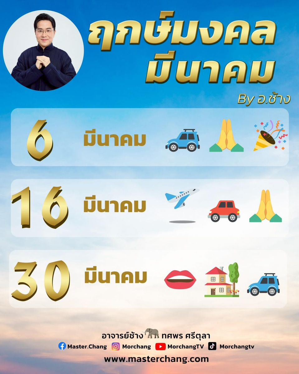 วันที่ 3 มี.ค.69 "หมอช้าง" นักพยากรณ์ชื่อดัง เปิดฤกษ์มงคล เดือนมีนาคม ใครที่กำลังมองหาฤกษ์ดี ฤกษ์สะดวก มีวันดีสำหรับฤกษ์มงคลเจรจา เปิดร้านค้าทำธุรกิจ ฤกษ์ขึ้นบ้านใหม่ ฤกษ์ออกรถ สำเร็จร่ำรวย มี 3 วันเท่านั้น ได้แก่
