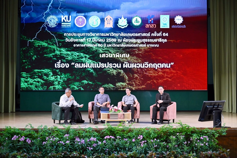 ดร.ปกรณ์ อาภาพันธุ์ ผู้อำนวยการสำนักงานพัฒนาเทคโนโลยีอวกาศและภูมิสารสนเทศ (องค์การมหาชน) (GISTDA) กล่าวในปาฐกถาพิเศษ เรื่อง “วิกฤตโลกร้อน: ถอดบทเรียนงานวิจัยสู่การป้องกันอย่างยั่งยืน” ในการประชุมทางวิชาการ มหาวิทยาลัยเกษตรศาสตร์ ครั้งที่ 64 ภายใต้แนวคิด “บูรณาการนวัตกรรมและสังคม: ก้าวสู่อนาคตที่ชาญฉลาดและยั่งยืน” (Bridging Innovation and Society: Toward a Smart and Sustainable Future) เมื่อวันที่ 17 มีนาคม 2569 ณ ห้องประชุมสุธรรม อารีกุล อาคารสารนิเทศ 50 ปี มหาวิทยาลัยเกษตรศาสตร์