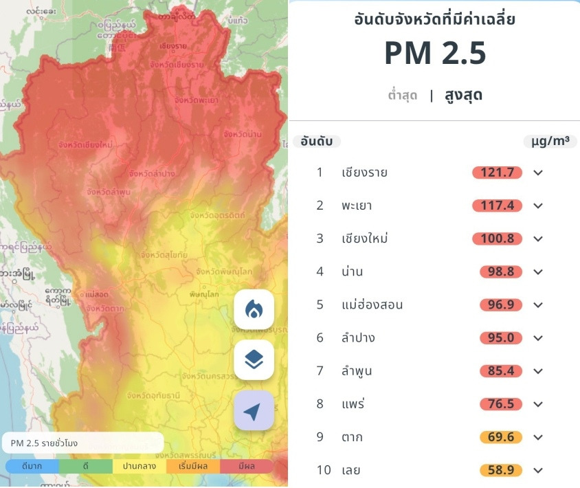 พื้นที่ภาคเหนือพบหลายจังหวัดที่มีค่าฝุ่นสูง – สูงมากต่อเนื่องจากช่วงเช้า อาทิ เชียงราย พะเยา เชียงใหม่ น่าน แม่ฮ่องสอน ลำปาง ลำพูน แพร่ เป็นต้น